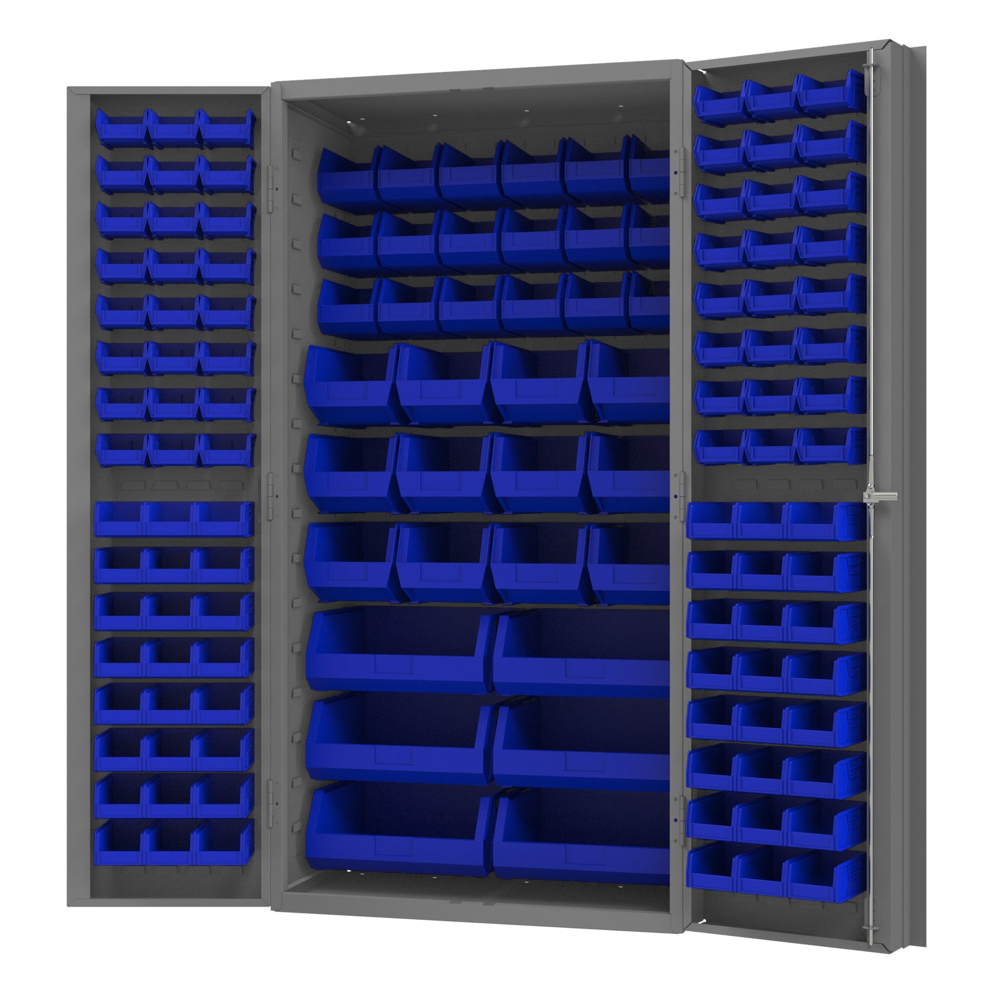 Heavy Duty Cabinet, 14 Gauge, 36 x 24 x 72, 132 Blue Bins, 4" Deep Box Doors with Louvered Panel, Lockable, Chrome Handle with Keys, Gray