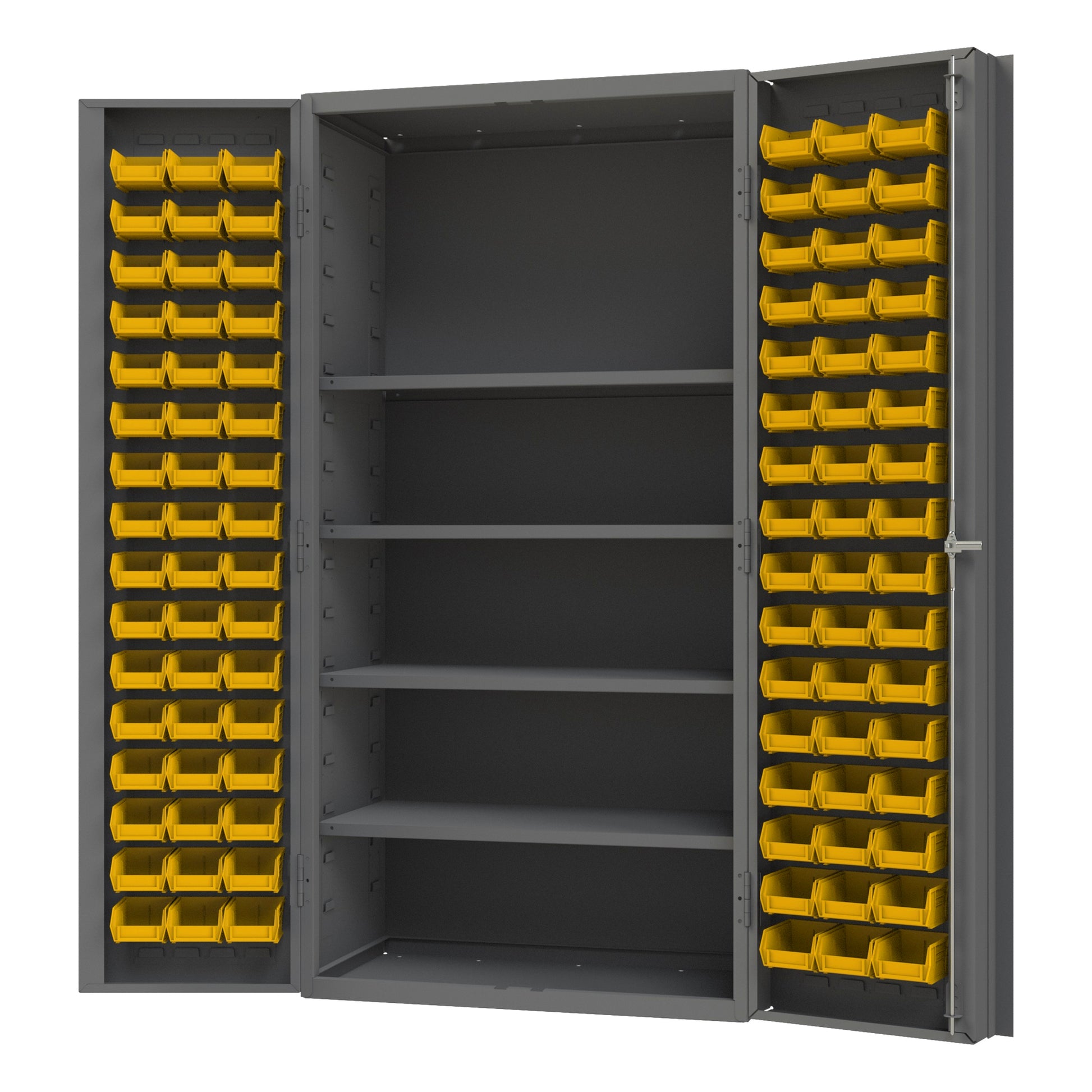 Heavy Duty Cabinet, 14 Gauge, 36 x 24 x 72, 4 Adjustable Shelves, 96 Yellow Bins, 4" Deep Box Doors with Louvered Panel, Lockable, Chrome Handle with Keys, Gray