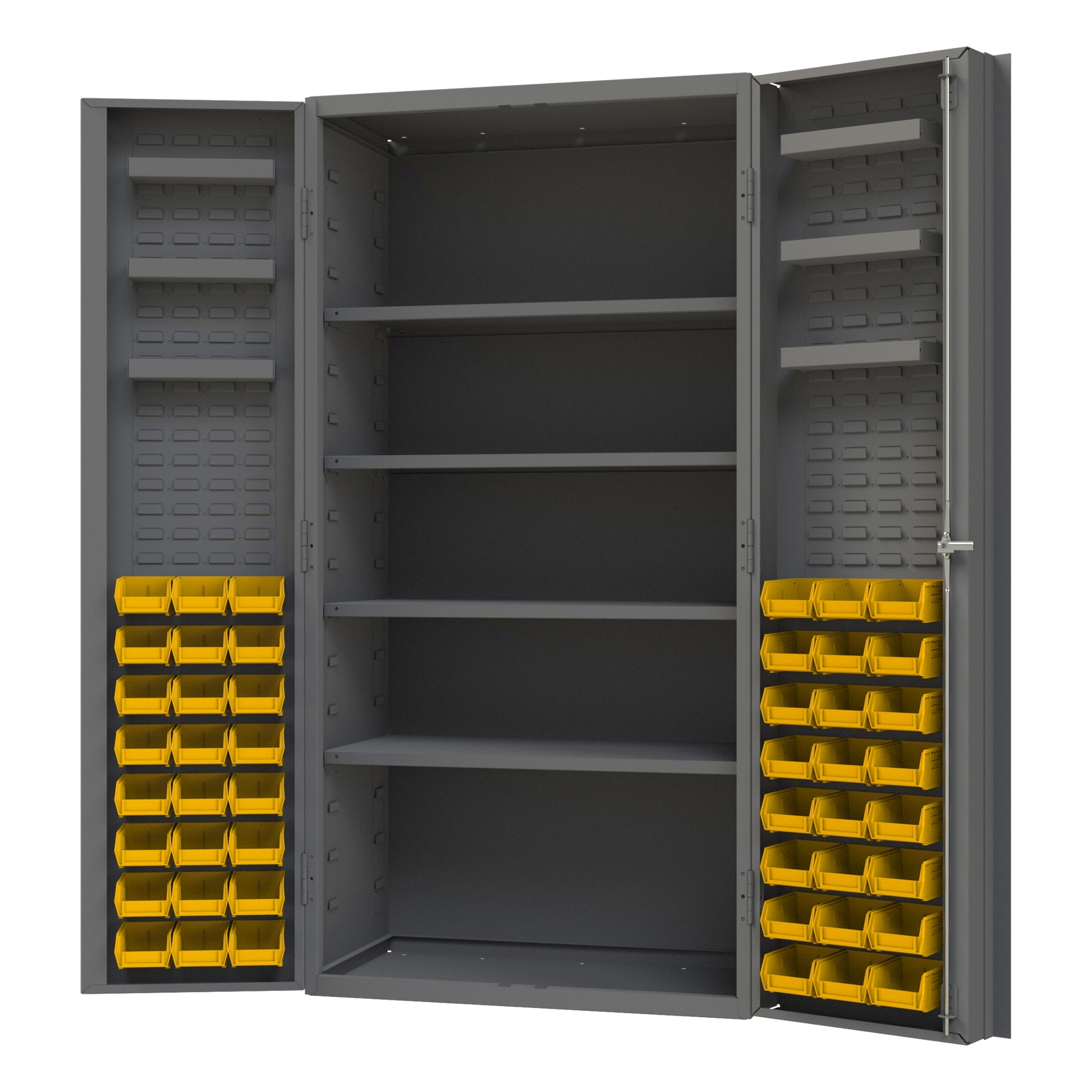 Heavy Duty Cabinet, 14 Gauge, 36 x 24 x 72, 4 Adjustable Shelves, 48 Yellow Bins, 4" Deep Box Doors with Louvered Panel, 6 Door Shelves, Lockable, Chrome Handle with Keys, Gray