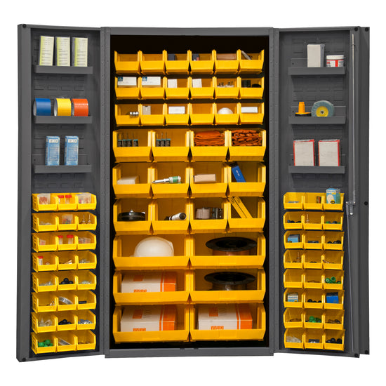 Heavy Duty Cabinet, 14 Gauge, 36 x 24 x 72, 84 Yellow Bins, 4" Deep Box Doors with Louvered Panel, 6 Door Shelves, Lockable, Chrome Handle with Keys, Gray