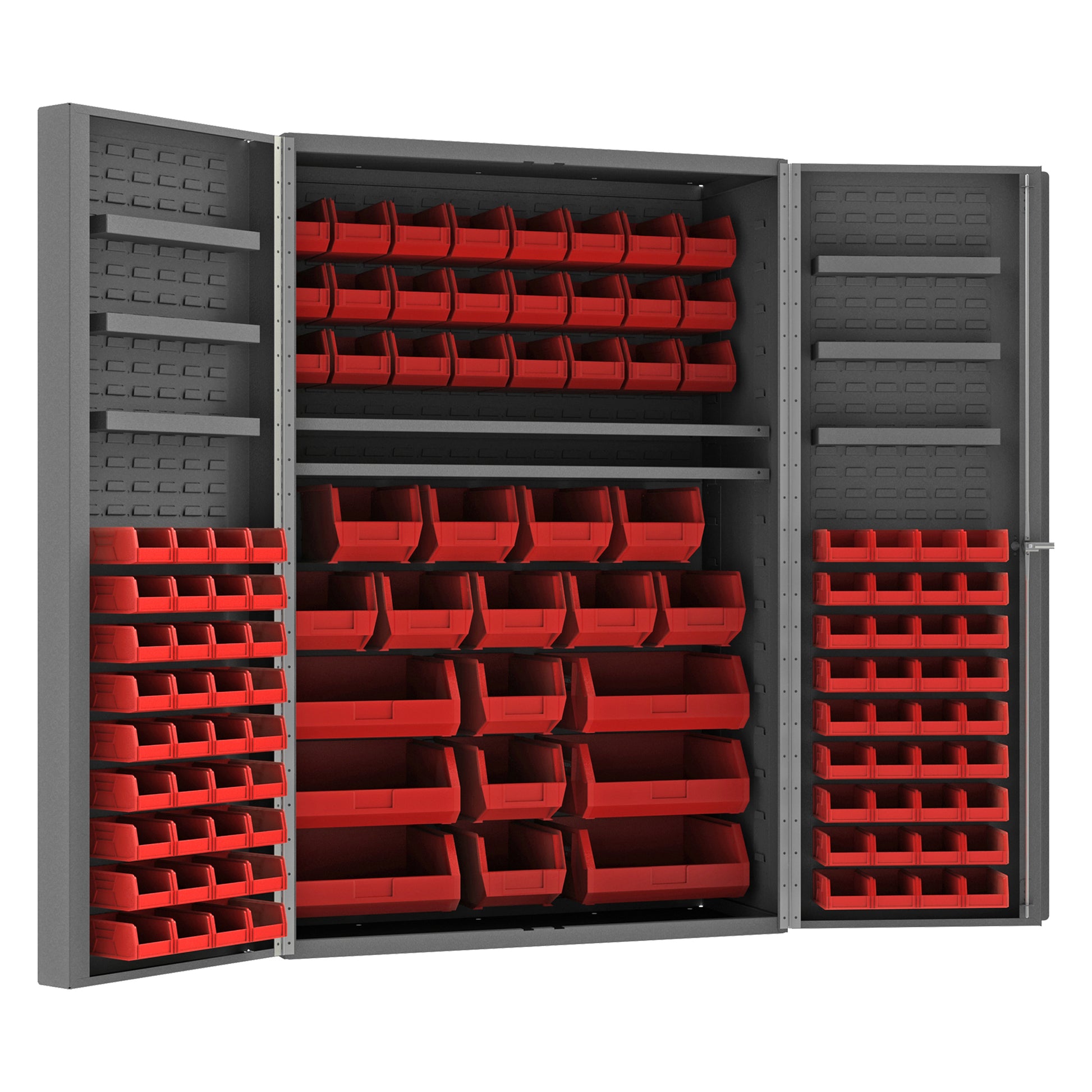 Heavy Duty Cabinet, 14 Gauge, 48 x 24 x 72, 6 Door Shelves, 114 Red Bins, 4" Deep Box Doors with Louvered Panel, 6 Door Shelves, Lockable, Chrome Handle with Keys, Gray