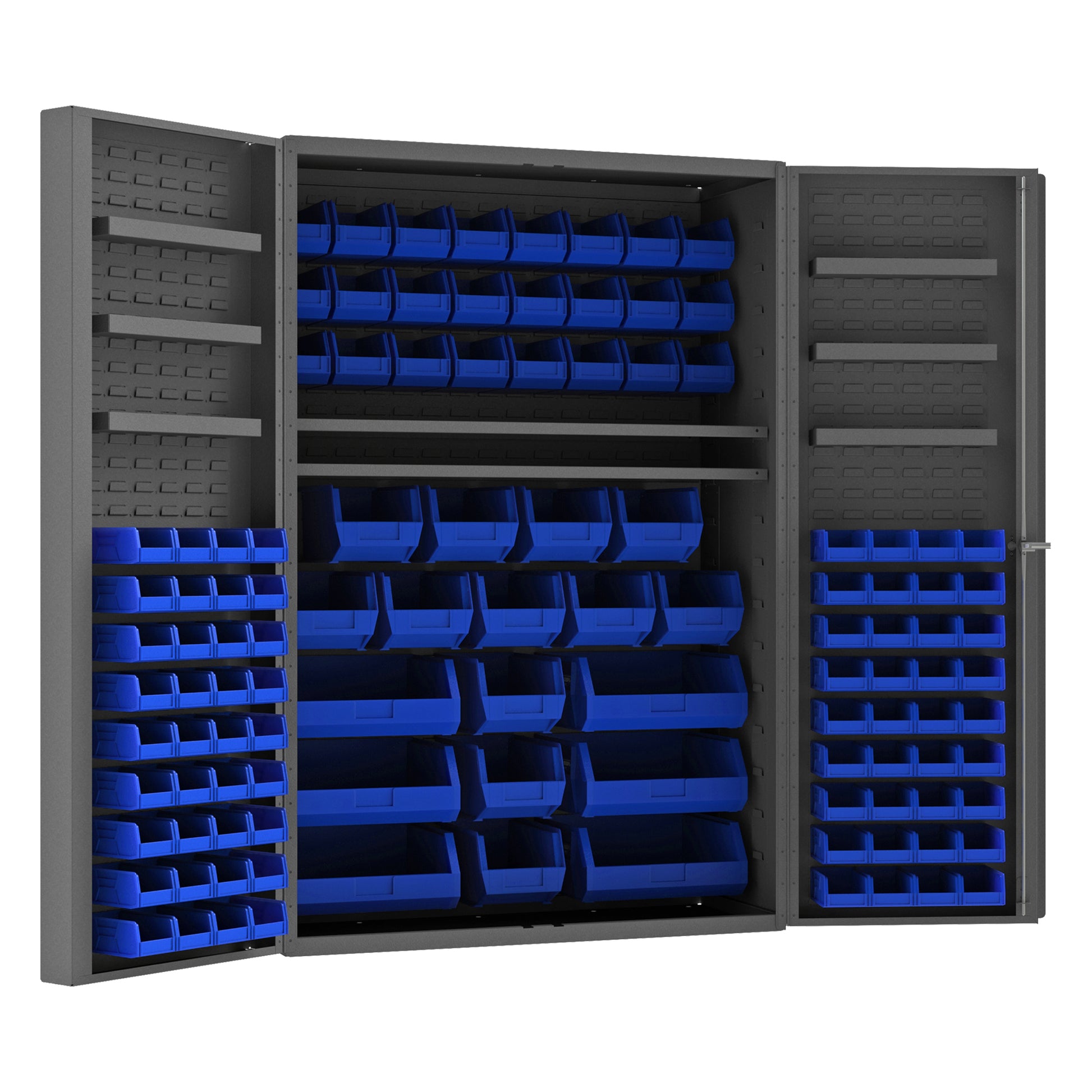 Heavy Duty Cabinet, 14 Gauge, 48 x 24 x 72, 6 Door Shelves, 114 Blue Bins, 4" Deep Box Doors with Louvered Panel, 6 Door Shelves, Lockable, Chrome Handle with Keys, Gray