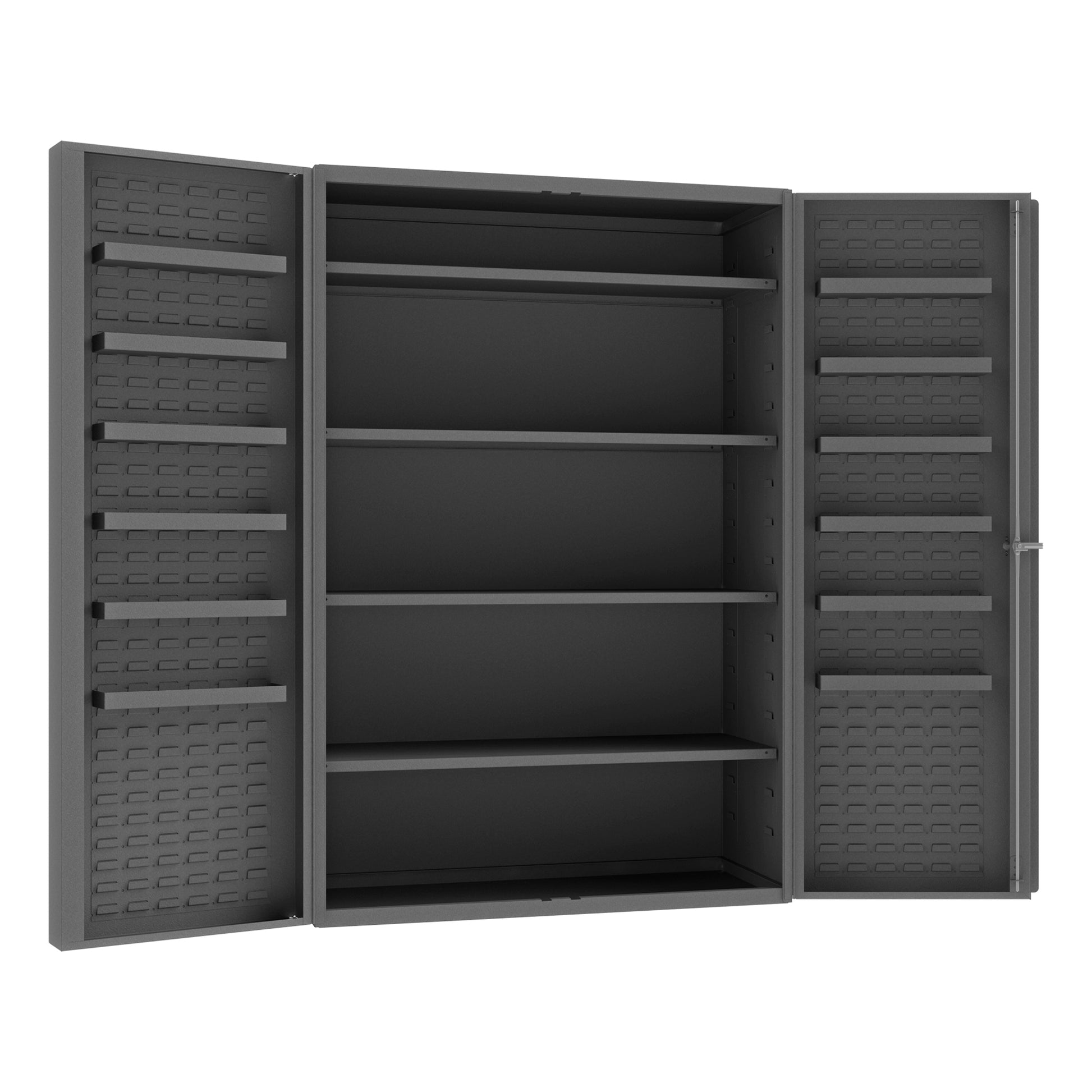 Heavy Duty Cabinet, 14 Gauge, 48 x 24 x 72, 4 Adjustable Shelves, 4" Deep Box Doors with Louvered Panel, 12 Door Shelves, Lockable, Chrome Handle with Keys, Gray