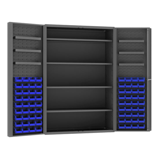 Heavy Duty Cabinet, 14 Gauge, 48 x 24 x 72, 4 Adjustable Shelves, 72 Blue Bins, 4" Deep Box Doors with Louvered Panel, 6 Door Shelves, Lockable, Chrome Handle with Keys, Gray
