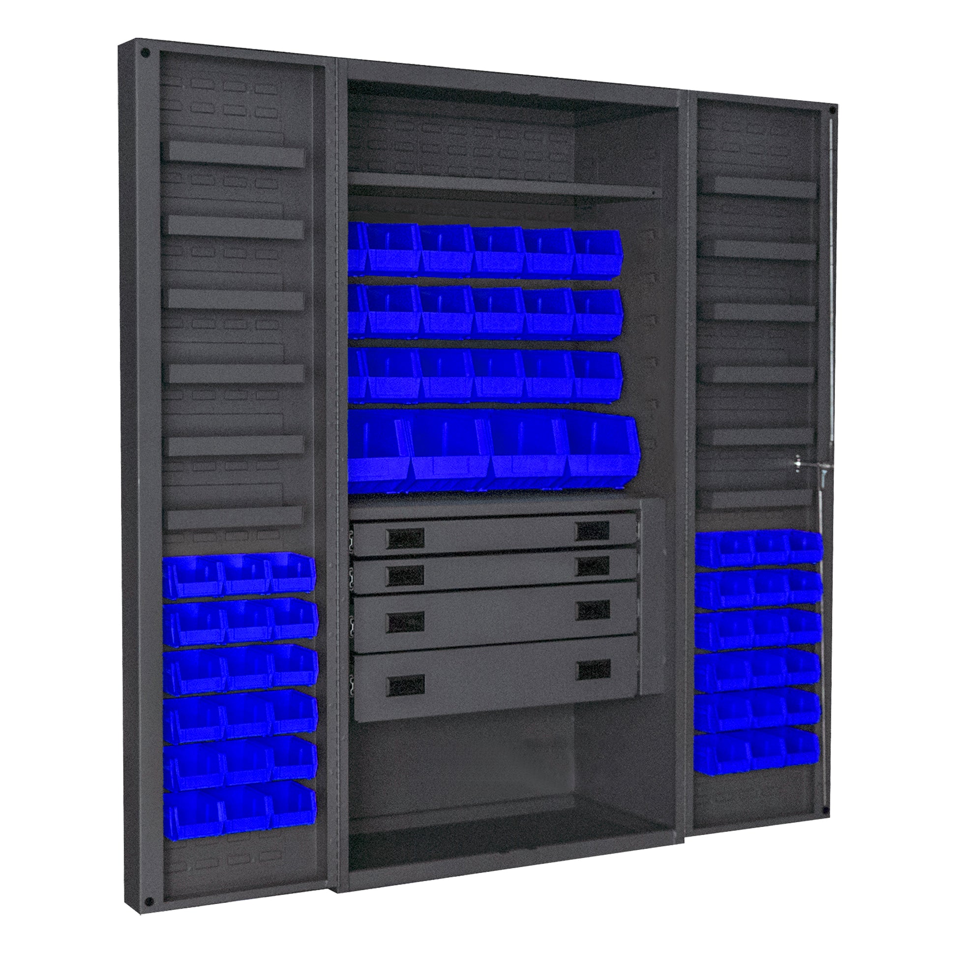 Heavy Duty Cabinet, 14 Gauge, 36 x 24 x 72, 1 Fixed Shelf, 1 Adjustable Shelf, 58 Blue Bins, 4" Deep Box Doors with Louvered Panel, 4 Drawers, 12 Door Shelves, Lockable, Chrome Handle with Keys, Gray