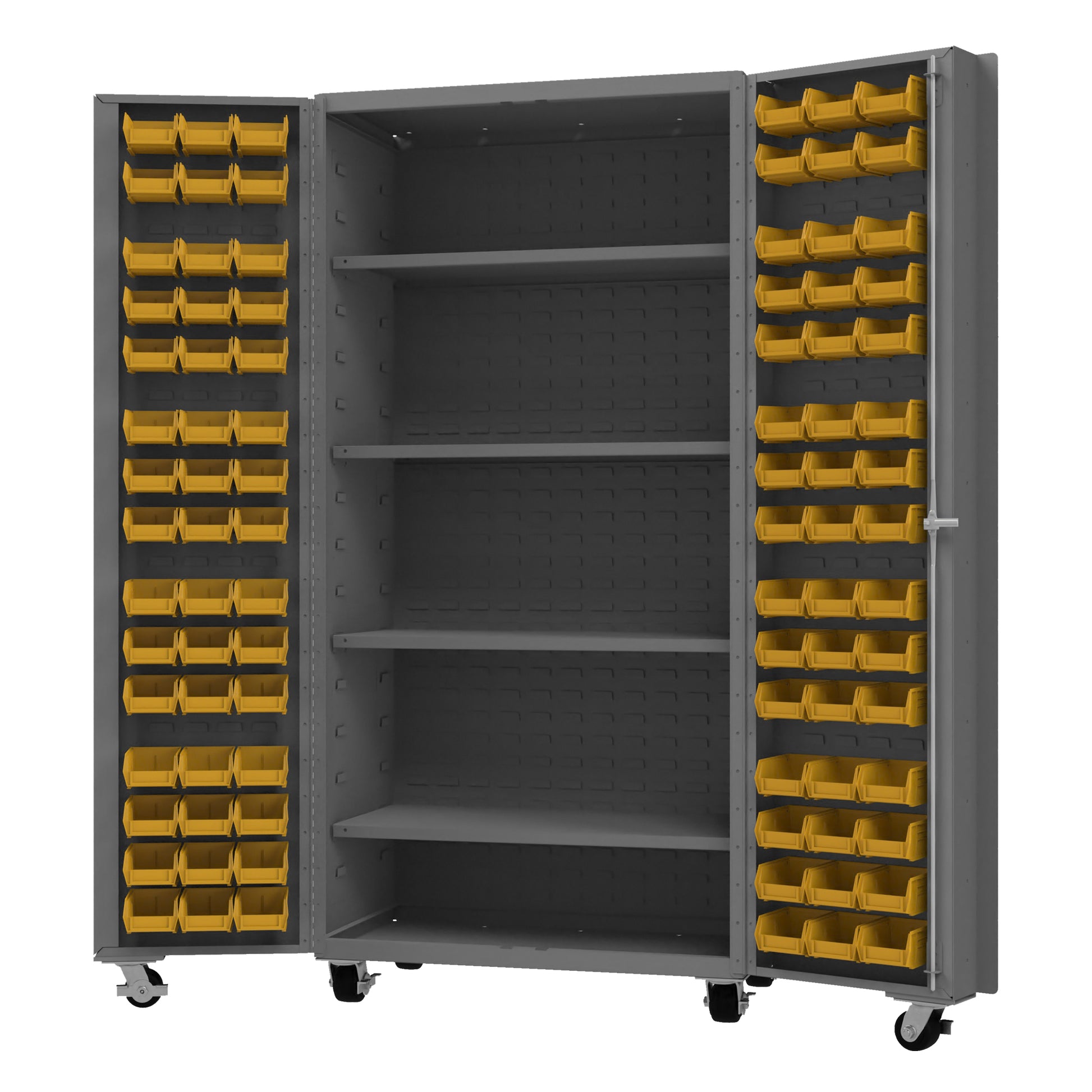 Mobile Heavy Duty Cabinet, 14 Gauge, 36 x 24 x 76, 96 Yellow Bins, 4 Shelves, 4" Deep Box Doors with Louvered Panel, Lockable, Chrome Handle with Keys, Gray