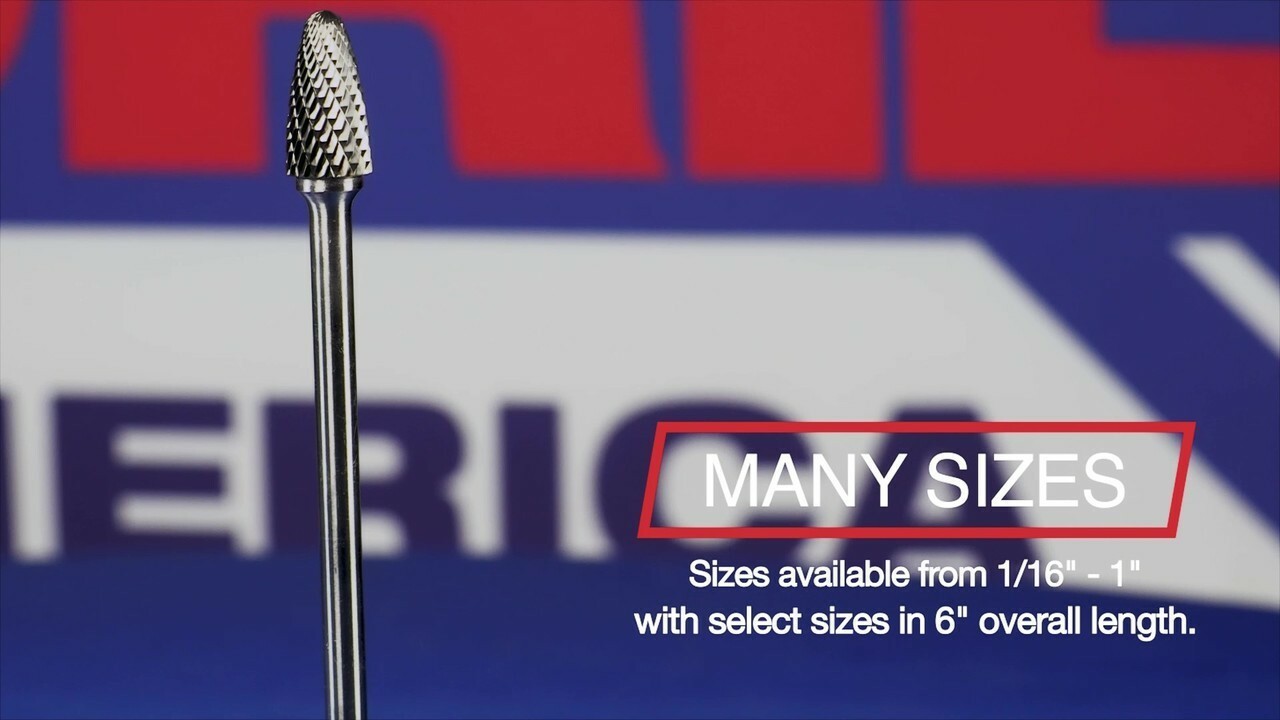 Sizes included: SA1, SC1, SD1, SE1, SF1, SG1, SM2 and SN1. Drill America Solid Carbide Burs are designed for cleaning out material in a wide-range of products including wood, plastics, stainless steel and other metals. Solid Carbide Burs have a long tool life and faster cutting speeds than other substrates. They are double-cut style and have rows of cutting teeth in two intersecting directions for fast material removal and a rougher finish. Drill America Solid Carbide Burs come in many shapes and sizes. Shapes include ball, cone, flame, tree and cylindrical. Sizes range from 1/16" to 1" in diameter with round shanks. 6” length burs available in select shapes and sizes.