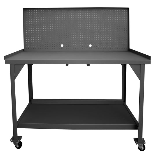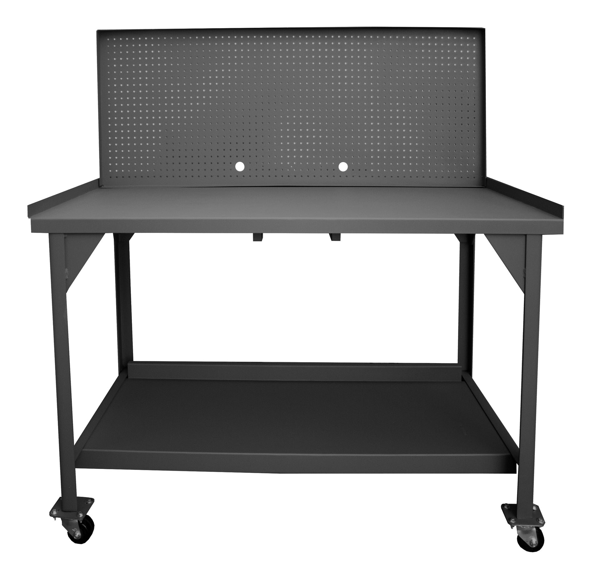 Mobile Workbench, 60 x 30, 12 Gauge, Steel Top, 1-1/2" End Stops, Pegboard Panel, Bottom Shelf with Back Stop, 4000 lbs. Capacity, 3" x 1-13/16" Phenolic Casters - (4) Swivel with Side Brakes, Gray