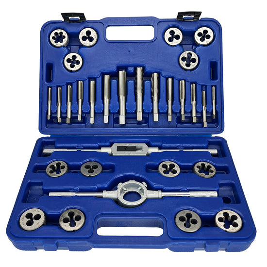 30 Piece NC NF HSS Round Tap and Die Set (1/4 - 3/4) with 1-1/2 OD Round Dies and Handles