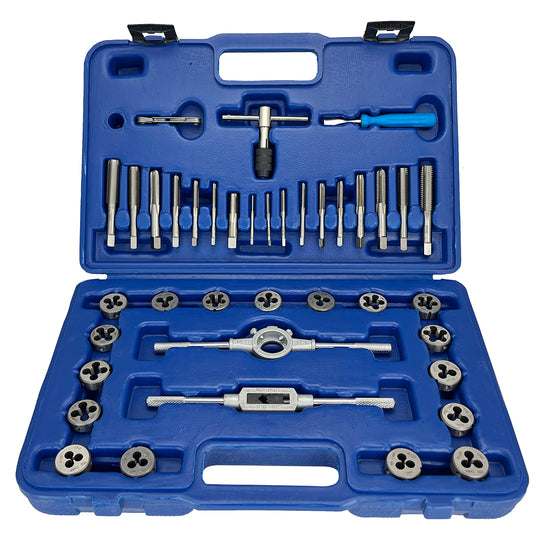 39 Piece NC NF HSS Round Tap and Die Set (#4 - 1/2) with 1 OD Round Dies and Handles