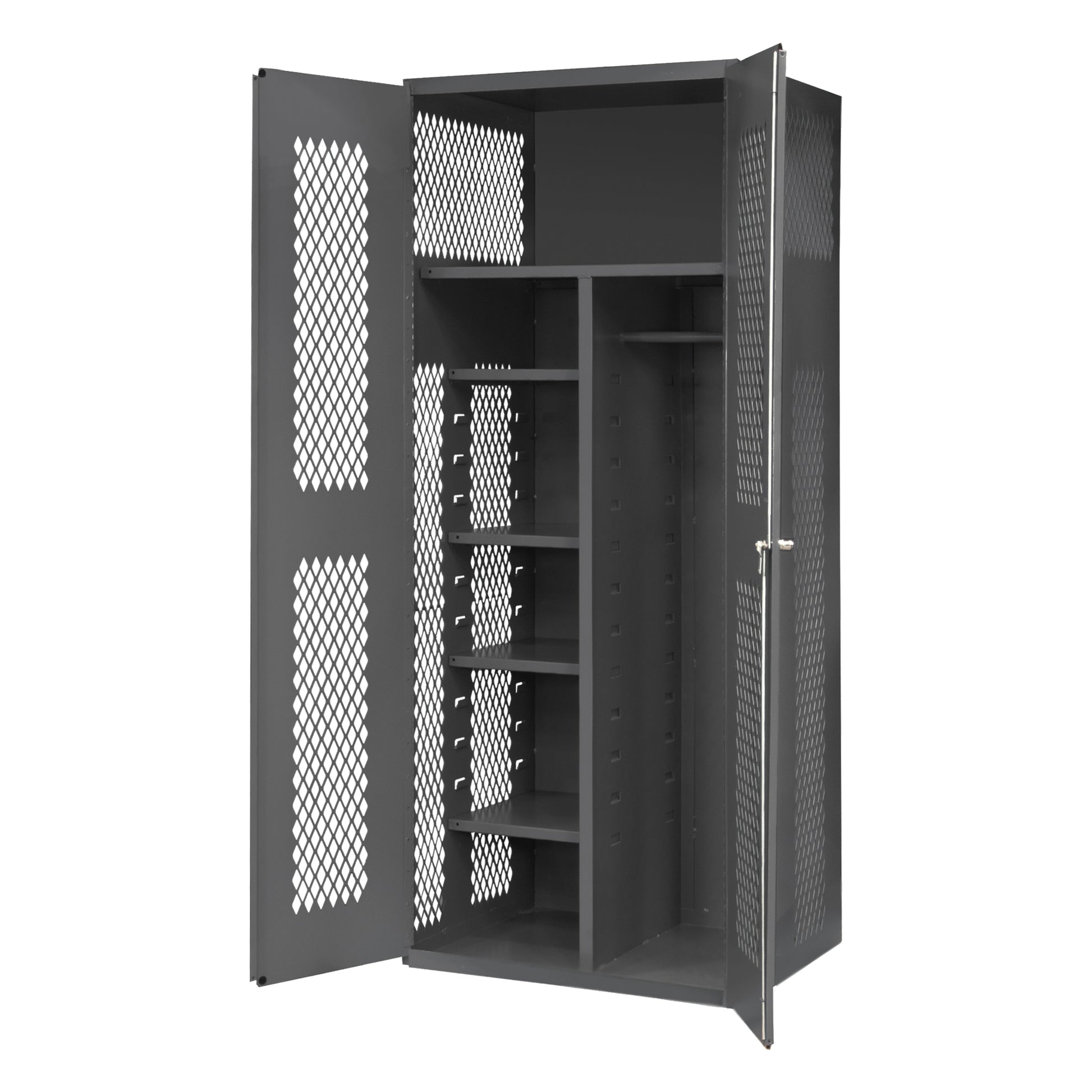Heavy Duty Cabinet, 14 Gauge, 36 x 24 x 84, 1 Fixed Shelf, 4 Adjustable, Hanger Bar, Flush Ventilated Doors, Lockable, Chrome Handle with Keys, Gray