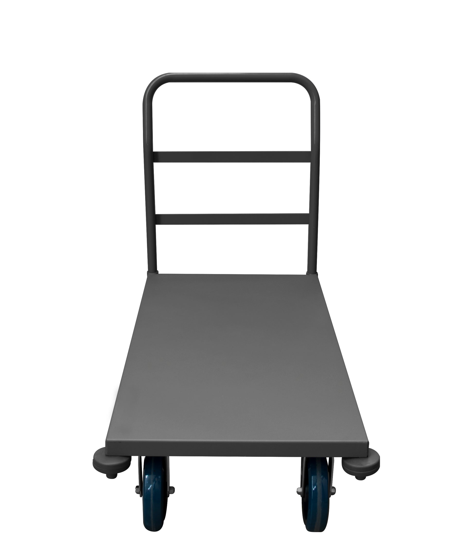 Platform Truck, 12 Gauge, 3600 lbs Capacity, Front Corner Bumpers, 30 x 48, Flush Deck, 8 x 2 Polyurethane - Non-Marking Casters - (2) Rigid, (2) Swivel with Side Brakes, Gray