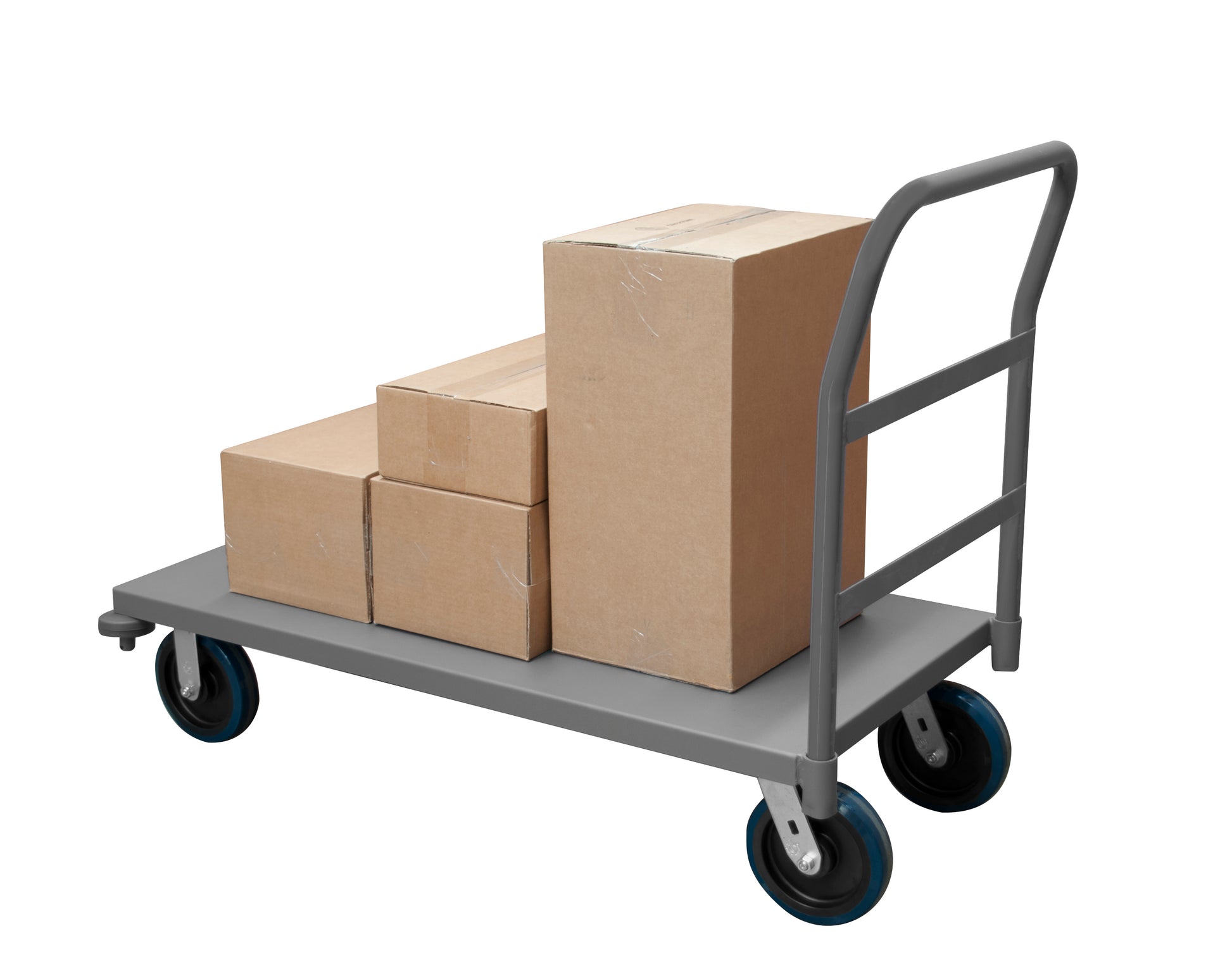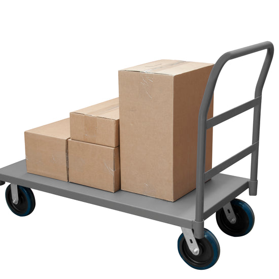 Platform Truck, 12 Gauge, 3600 lbs Capacity, Front Corner Bumpers, 36 x 60, Flush Deck, 8 x 2 Polyurethane - Non-Marking Casters - (2) Rigid, (2) Swivel with Side Brakes, Gray