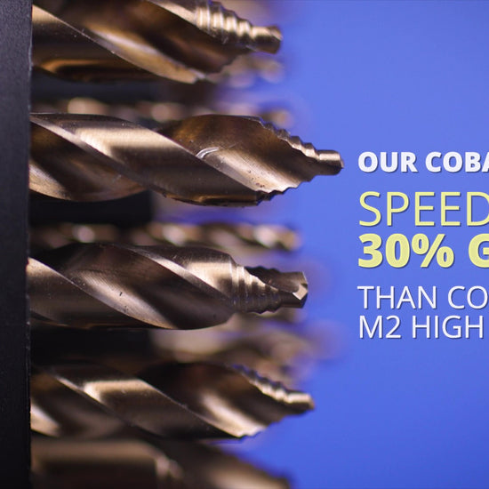 Drill America Gold Stepped Point Cobalt Drill Bits start easier, drill faster, increase lifespan and reduce heat compared to standard drill bits. They can be used to enlarge existing holes or to create new, smoother holes in a wide range of materials such as acrylics, steel, metal, brass and other hard metals. These drills have a 135 degree split point tip and a round shank.