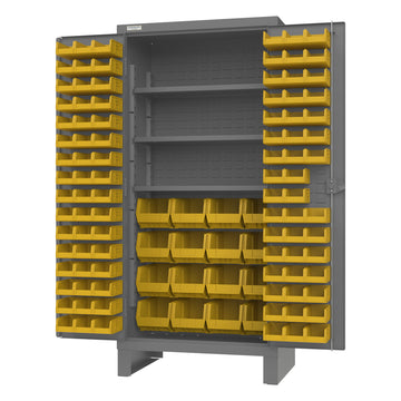 Extra Heavy Duty Cabinet, 12 Gauge, 36 x 24 x 78, 3 Adjustable Shelves, 108 Yellow Bins, Recessed Door with Louvered Panel, Cast Iron Pad-lockable Handle, Gray