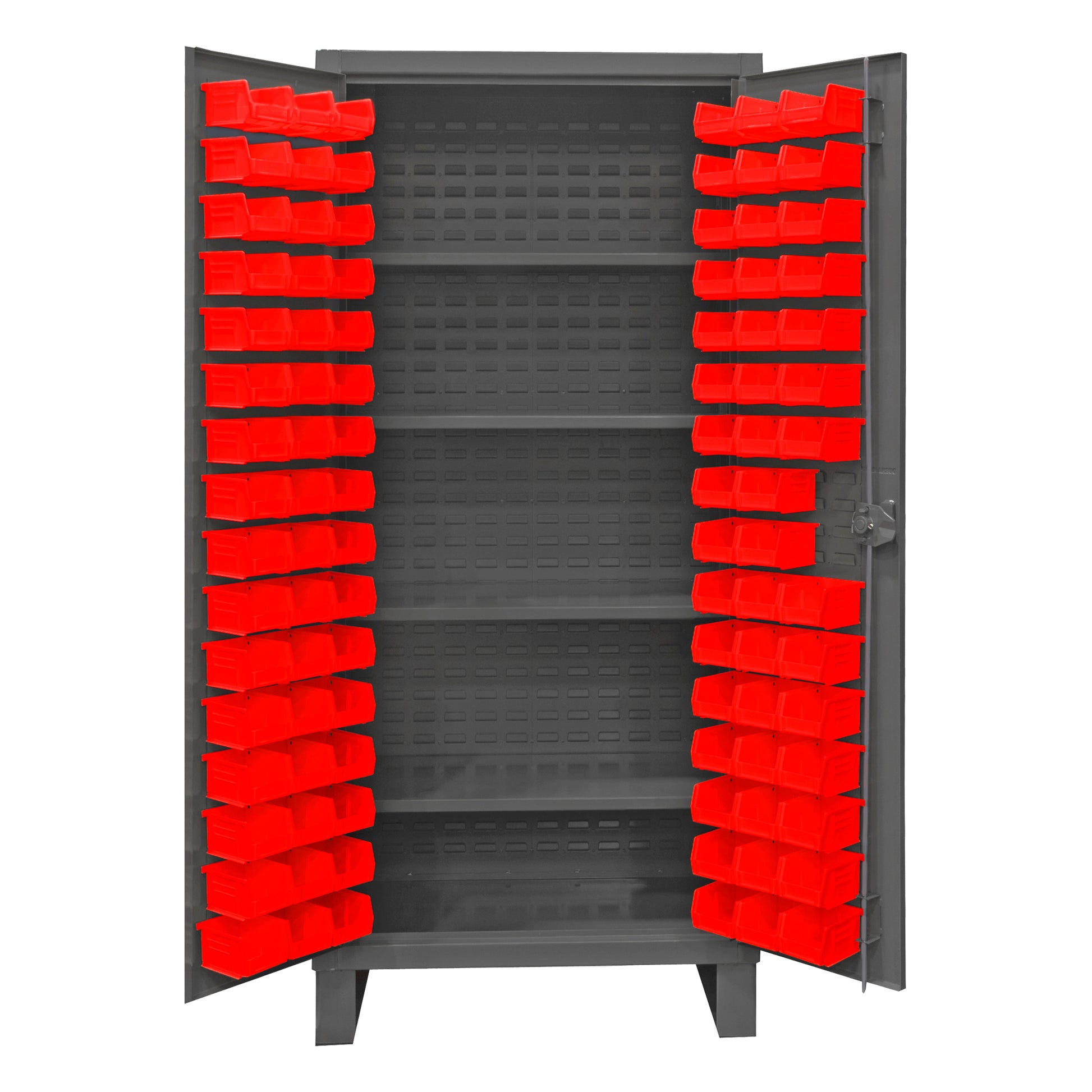 Extra Heavy Duty Cabinet, 12 Gauge, 36 x 24 x 78, 4 Adjustable Shelves, 96 Red Bins, Recessed Door with Louvered Panel, 6 Door Shelves, Cast Iron Pad-lockable Handle, Gray