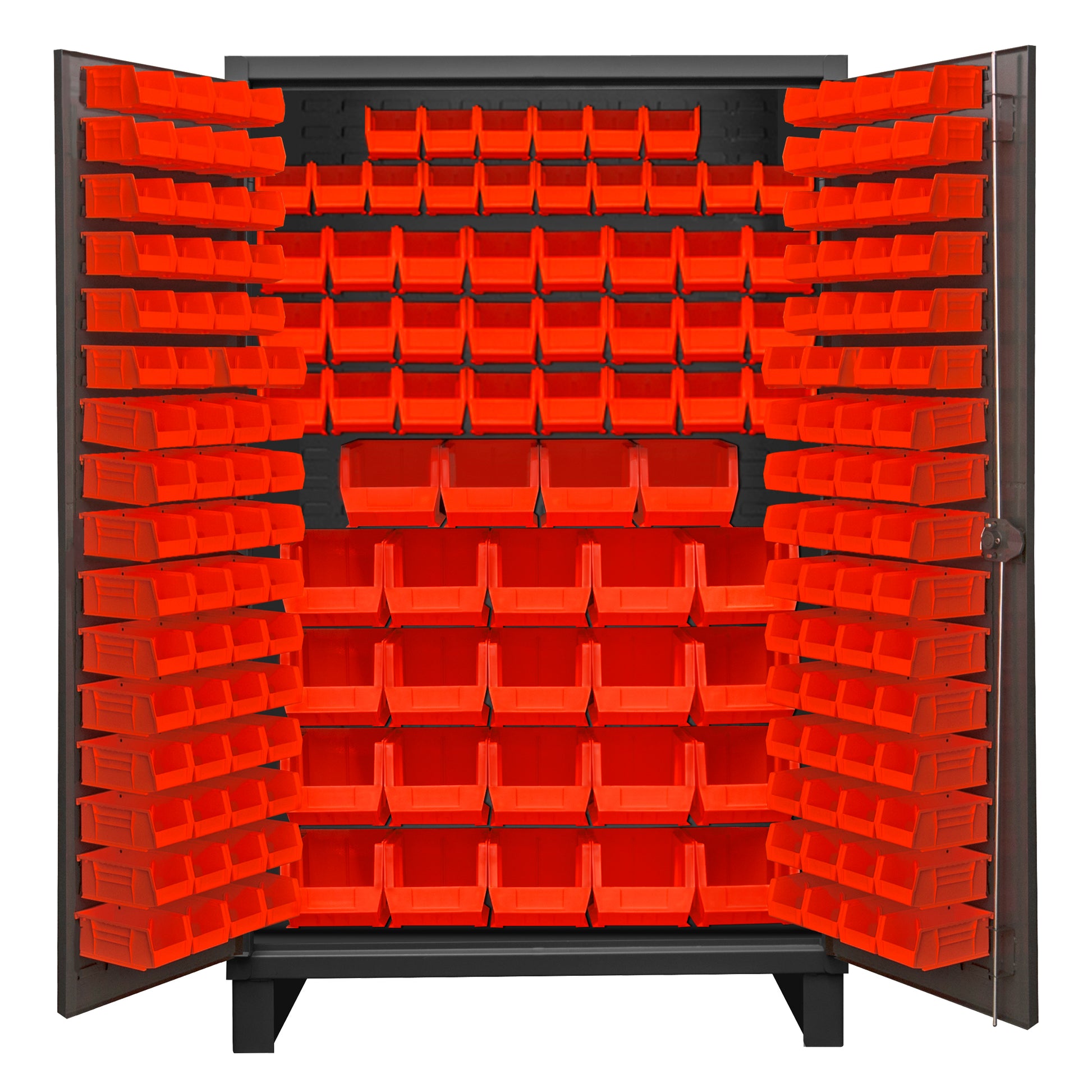 Extra Heavy Duty Cabinet, 12 Gauge, 48 x 24 x 78, 192 Red Bins, Recessed Door with Louvered Panel, Cast Iron Pad-lockable Handle, Gray