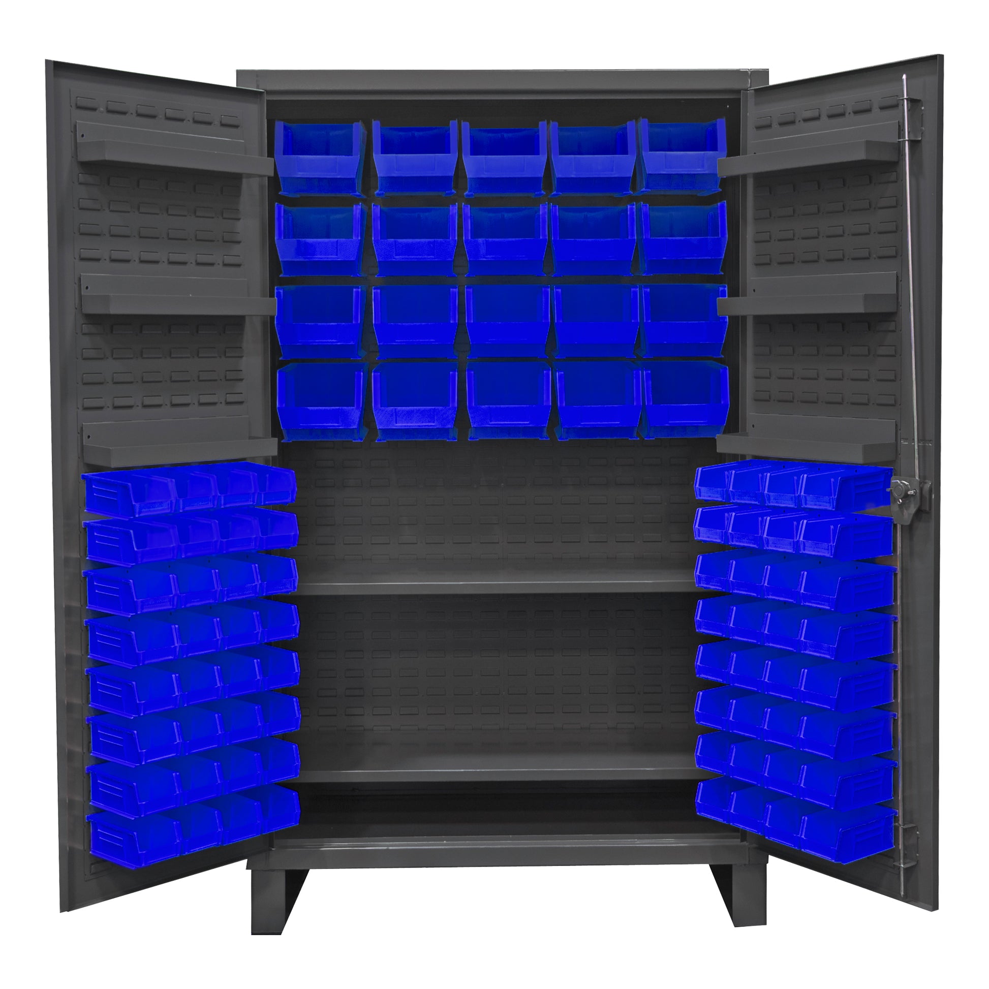 Extra Heavy Duty Cabinet, 12 Gauge, 48 x 24 x 78, 2 Adjustable Shelves, 84 Blue Bins, Recessed Door with Louvered Panel, 6 Door Shelves, Cast Iron Pad-lockable Handle, Gray