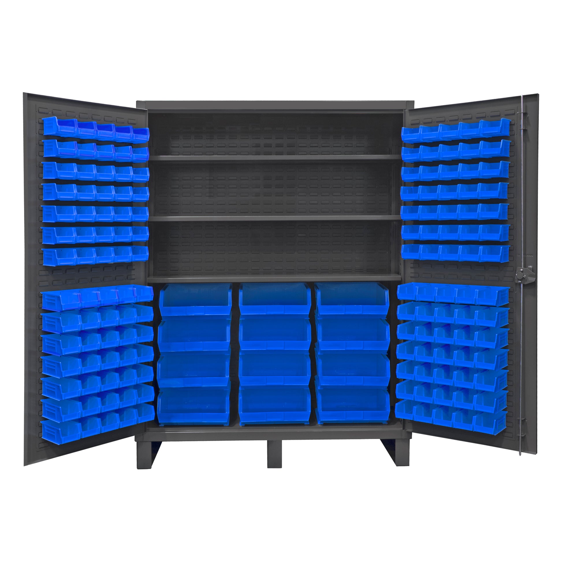 Extra Heavy Duty Cabinet, 12 Gauge, 60 x 24 x 78, 3 Adjustable Shelves, 156 Blue Bins, Recessed Door with Louvered Panel, Cast Iron Pad-lockable Handle, Gray