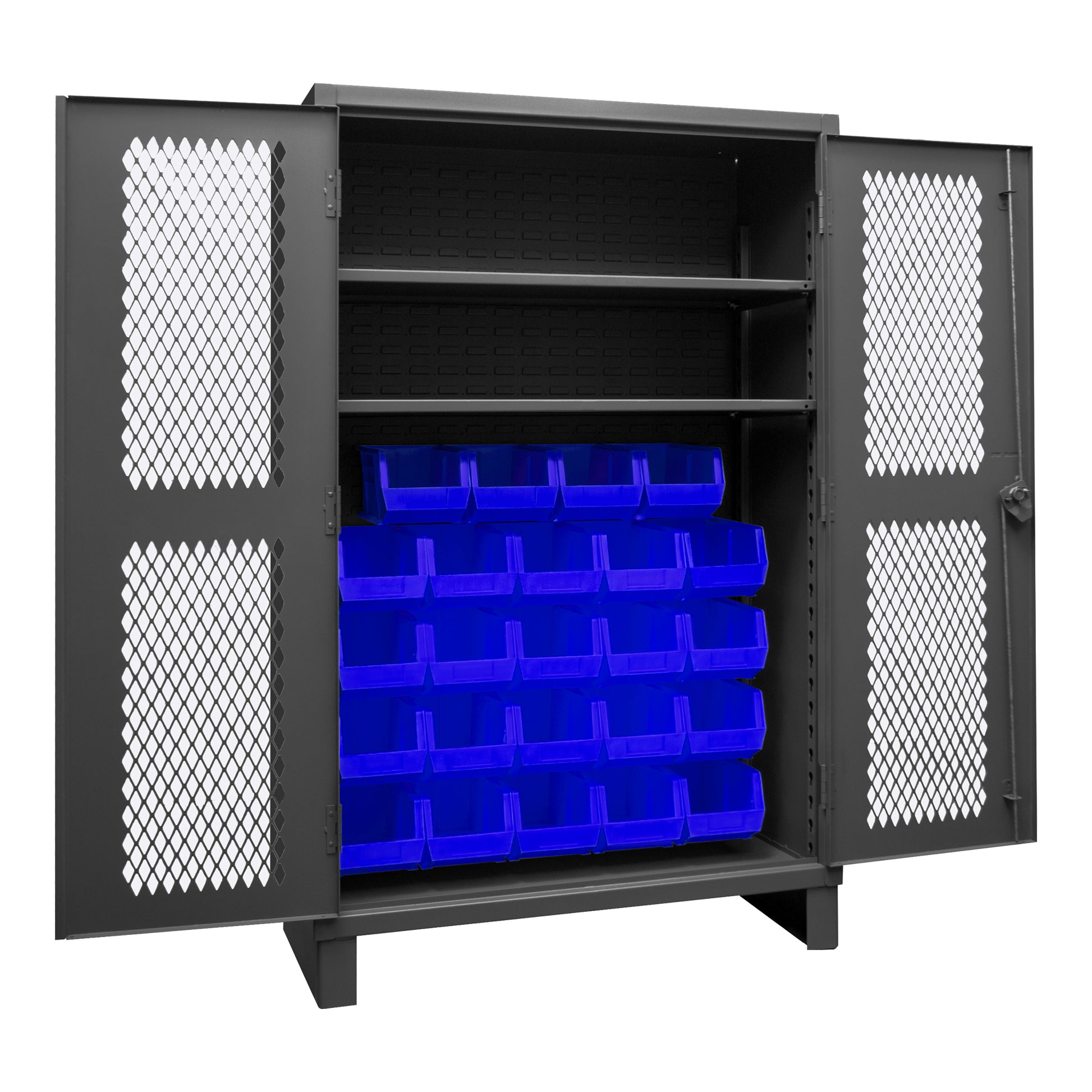 Extra Heavy Duty Cabinet, 12 Gauge, 48 x 24 x 78, 2 Adjustable Shelves, 24 Blue Bins, Recessed Ventilated Doors, Cast Iron Pad-lockable Handle, Gray