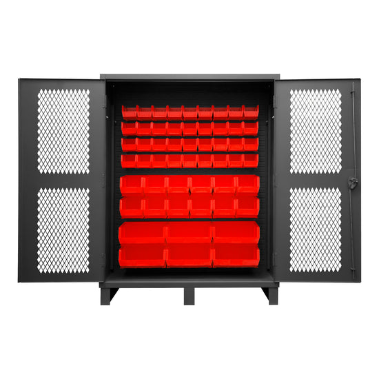 Extra Heavy Duty Cabinet, 12 Gauge, 60 x 24 x 78, 54 Red Bins, Recessed Ventilated Doors, Cast Iron Pad-lockable Handle, Gray