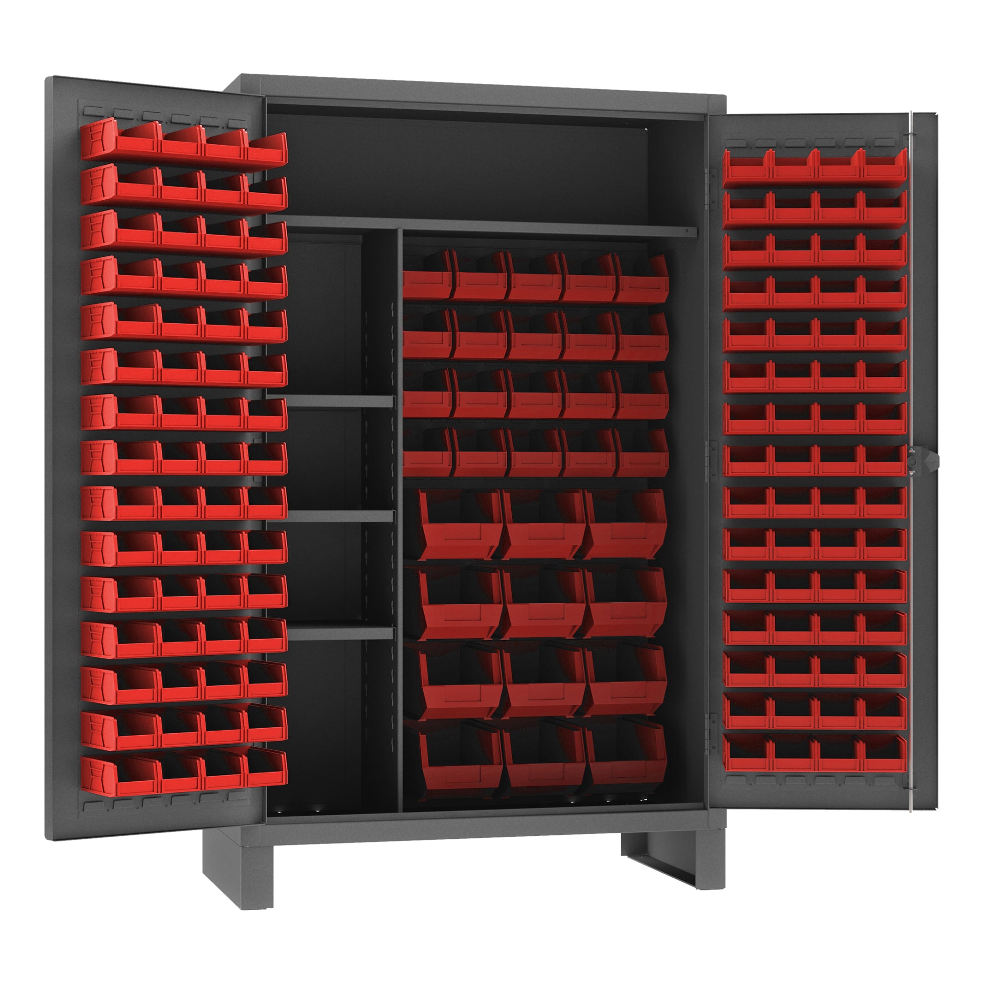 Maintenance Cabinet, 12 Gauge, 48 x 24 x 78, 1 Fixed Shelf, 3 Adjustable, 156 Red Bins, Recessed Door with Louvered Panel, Cast Iron Pad-lockable Handle, Gray