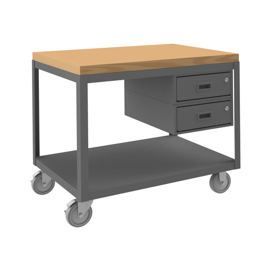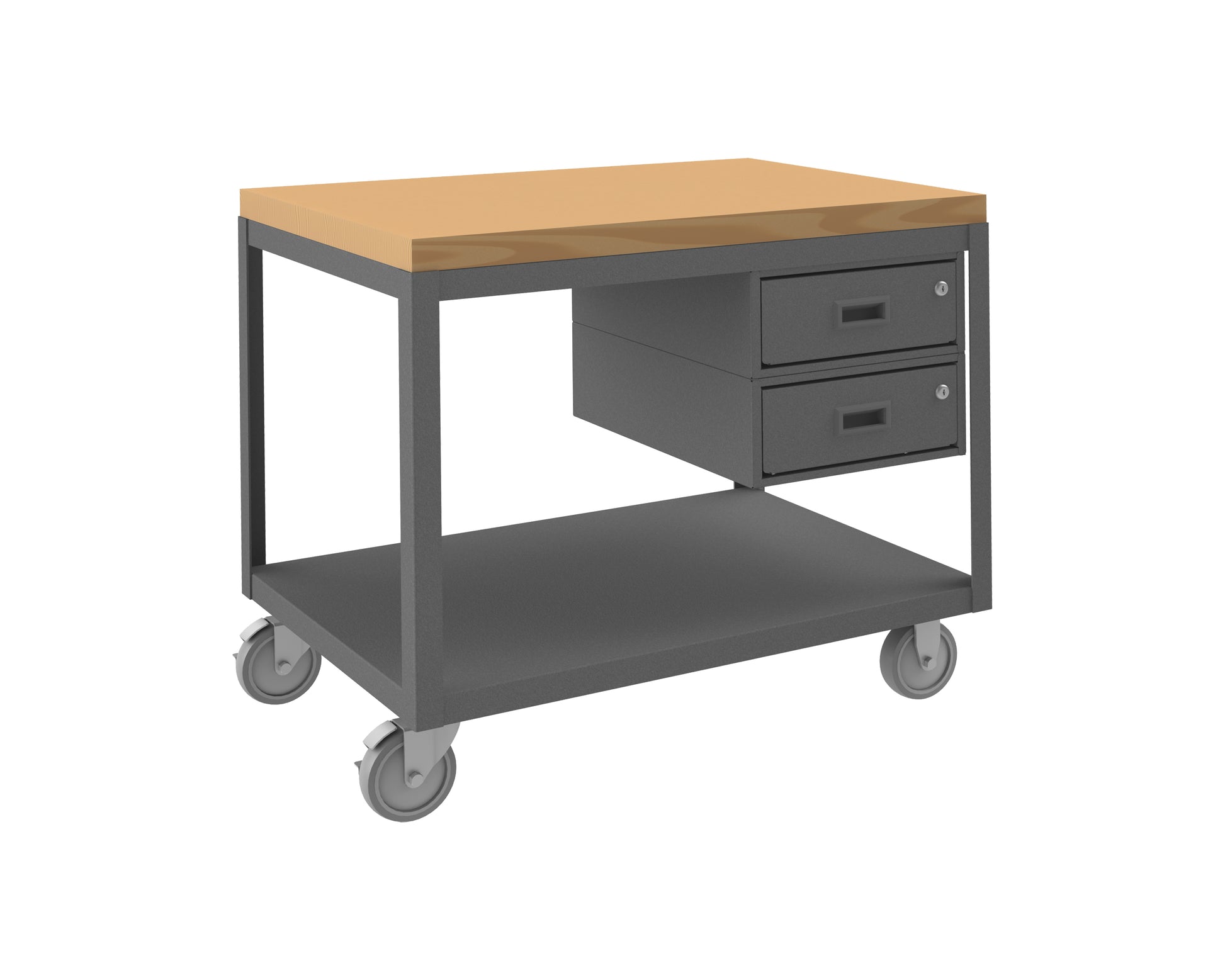 High Deck Mobile Table, 14 Gauge Steel, 2 Shelves, 24 x 36, 1200 lbs. Capacity, Maple Top, (2) Drawers, 5" x 1-1/4" Polyurethane Casters - (2) Rigid, (2) Swivel with Side Brakes, Gray