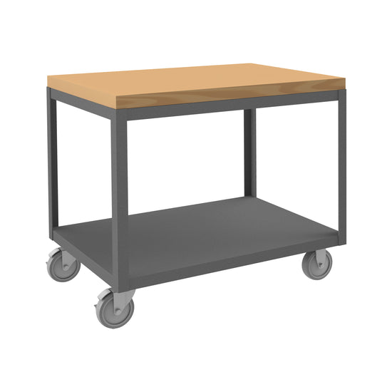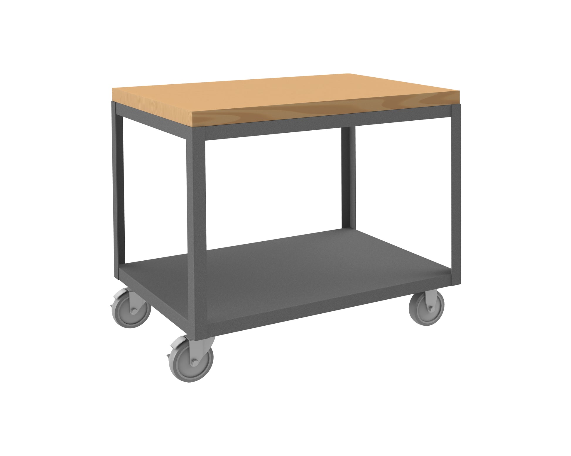 High Deck Mobile Table, 14 Gauge Steel, 2 Shelves, 24 x 36, 1200 lbs. Capacity, Maple Top, 5" x 1-1/4" Polyurethane Casters - (2) Rigid, (2) Swivel with Side Brakes, Gray