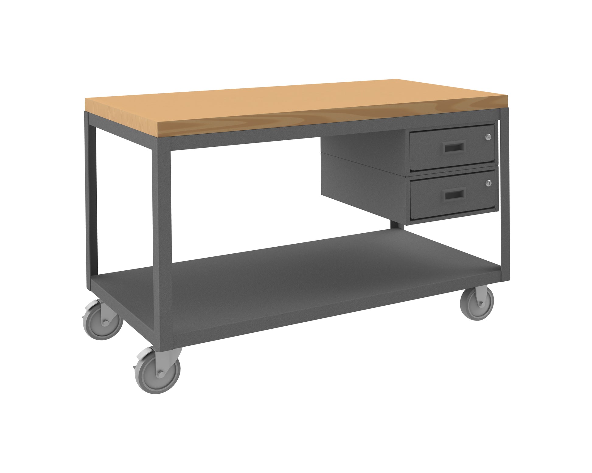 High Deck Mobile Table, 14 Gauge Steel, 2 Shelves, 24 x 48, 1200 lbs. Capacity, Maple Top, 2 Drawers, 5" x 1-1/4" Polyurethane Casters - (2) Rigid, (2) Swivel with Side Brakes, Gray