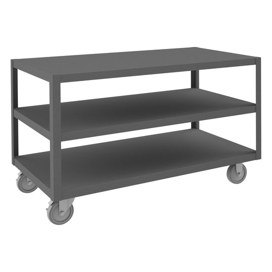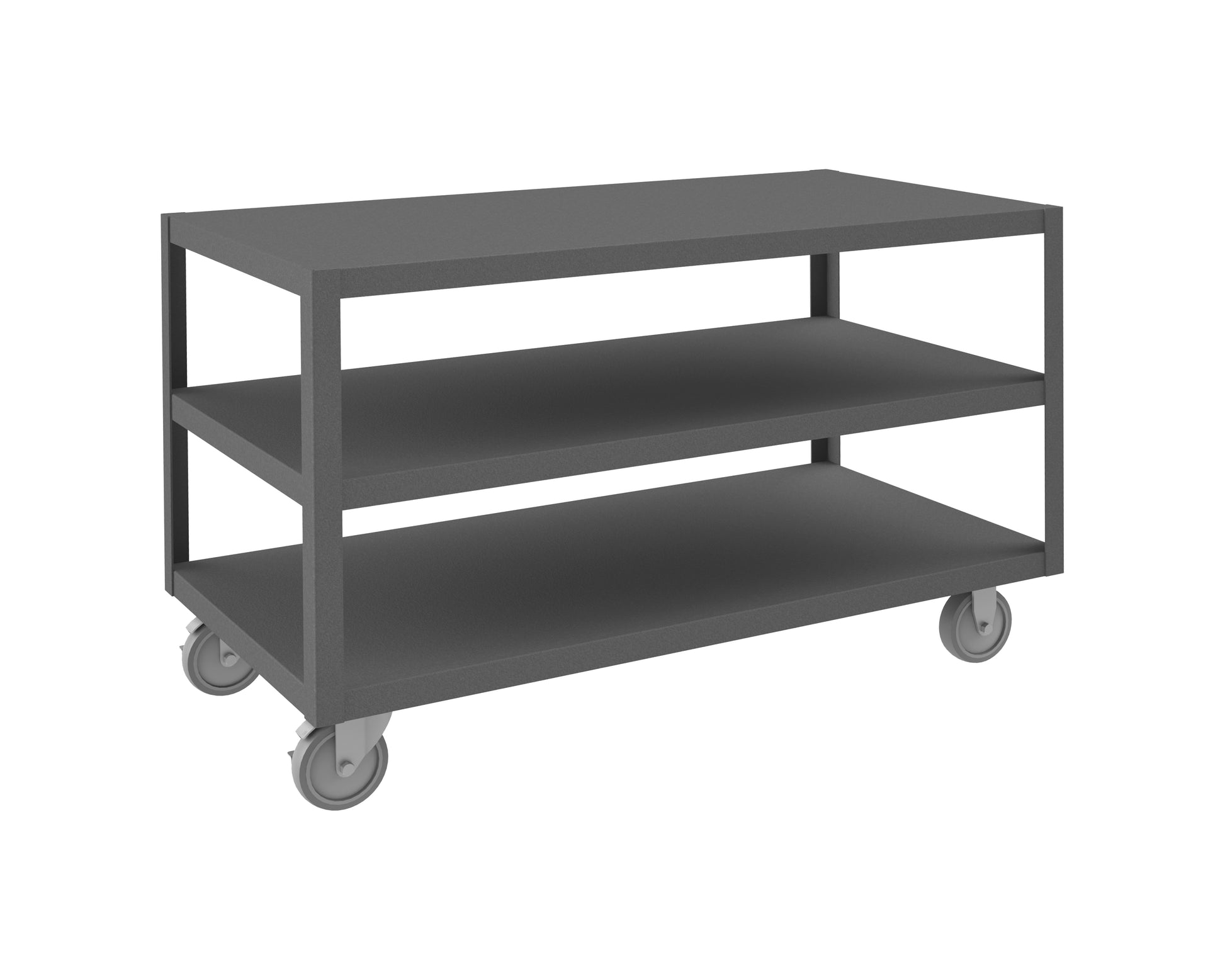 High Deck Mobile Table, 14 Gauge Steel, 3 Shelves, 24 x 48, 1200 lbs. Capacity, 5" x 1-1/4" Polyurethane Casters - (2) Rigid, (2) Swivel with Side Brakes, Gray