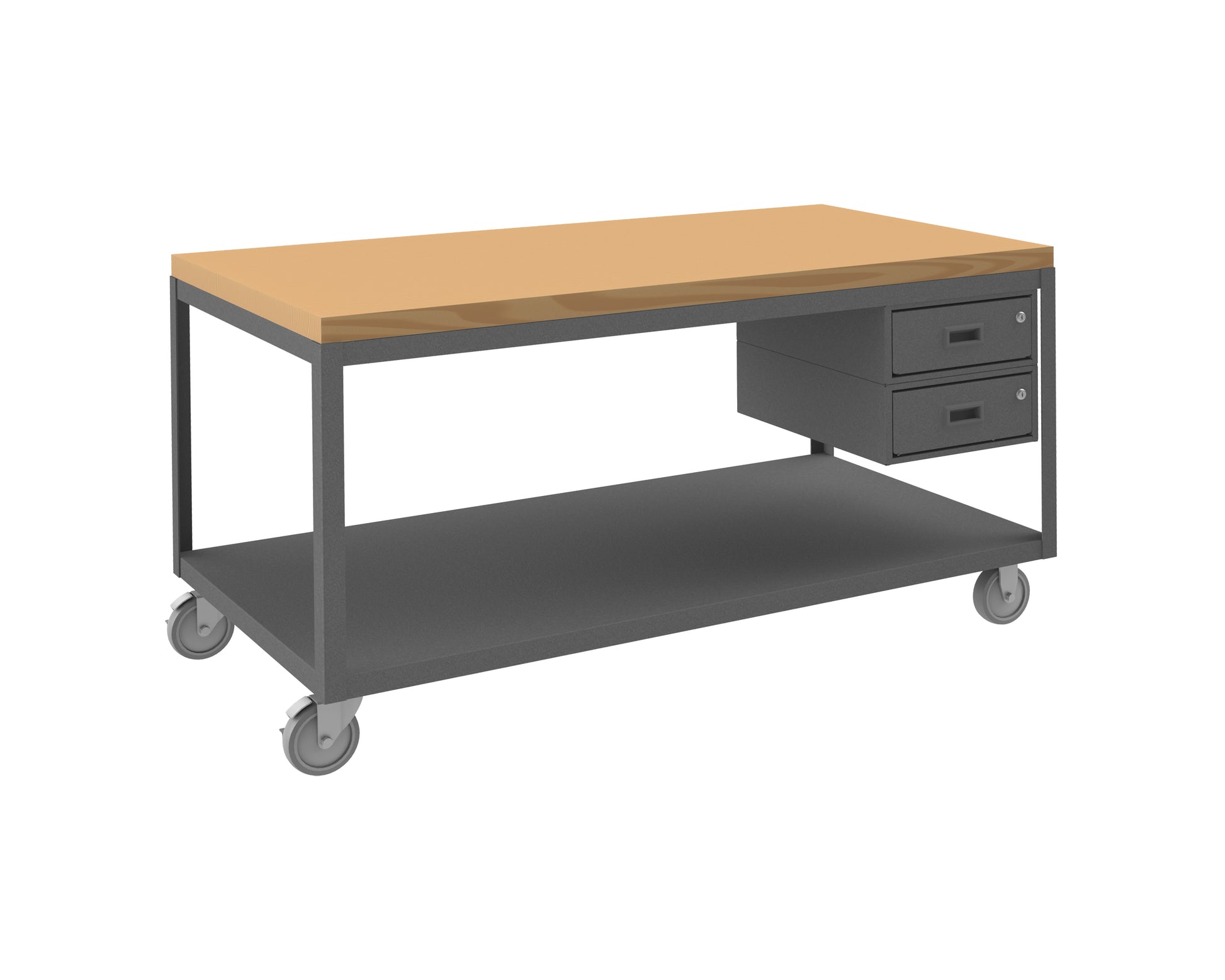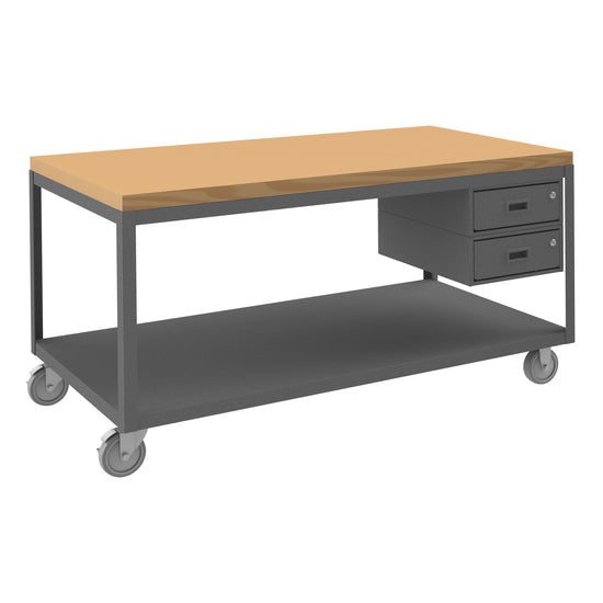 High Deck Mobile Table, 14 Gauge Steel, 2 Shelves, 30 x 60, 1200 lbs. Capacity, Maple Top, 2 Drawers, 5" x 1-1/4" Polyurethane Casters - (2) Rigid, (2) Swivel with Side Brakes, Gray