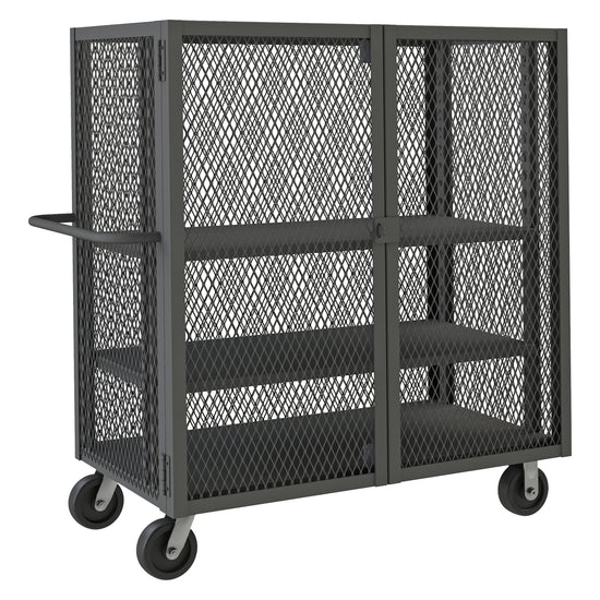 Security Mesh Truck, 24 x 48, 6" x 2" Phenolic Casters - (2) Rigid, (2) Swivel, 2 Adjustable Shelves, 1 Base Shelf, Tubular Push Handle, Pad-Lockable Doors, Gray