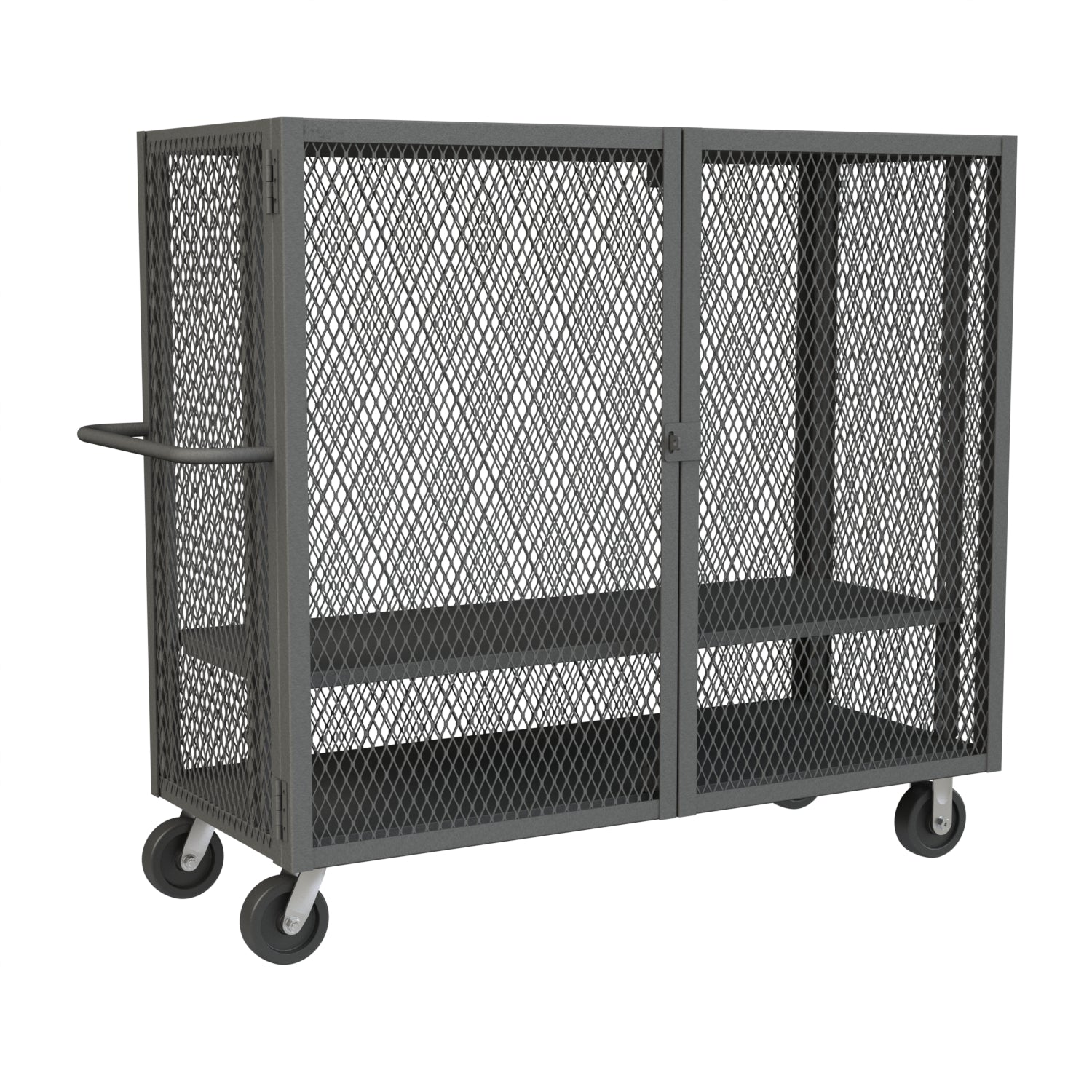 Security Mesh Truck, 24 x 60, 6" x 2" Phenolic Casters - (2) Rigid, (2) Swivel, 1 Adjustable Shelf, 1 Base Shelf, Tubular Push Handle, Pad-Lockable Doors, Gray