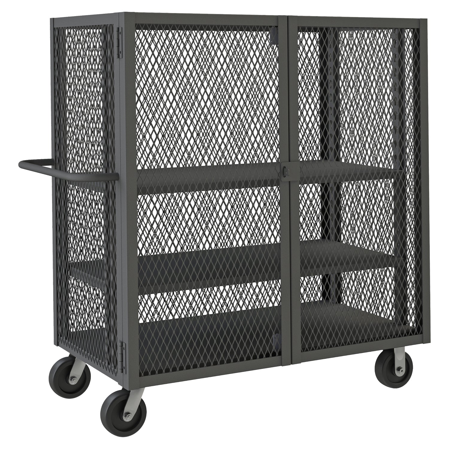Security Mesh Truck, 30 x 48, 6" x 2" Phenolic Casters, (2) Rigid, (2) Swivel, 2 Adjustable Shelves, 1 Base Shelf, Tubular Push Handle And Pad-Lockable Doors, Gray