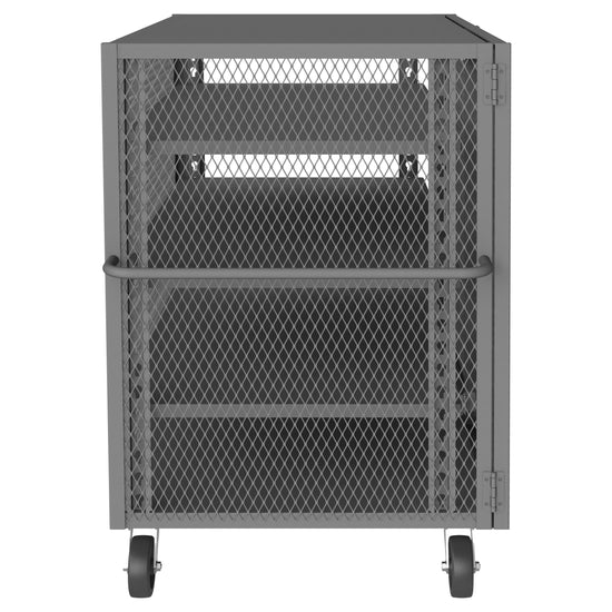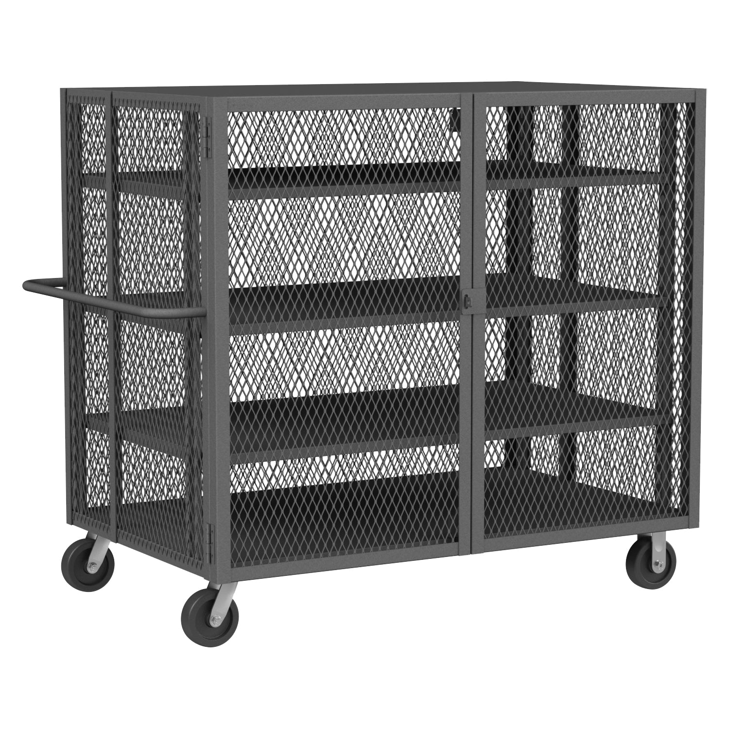 Security Mesh Truck, 36 x 60, 6" x 2" Phenolic Casters - (2) Rigid, (2) Swivel, 3 Adjustable Shelves, 1 Base Shelf, Tubular Push Handle, Pad-Lockable Doors, Gray