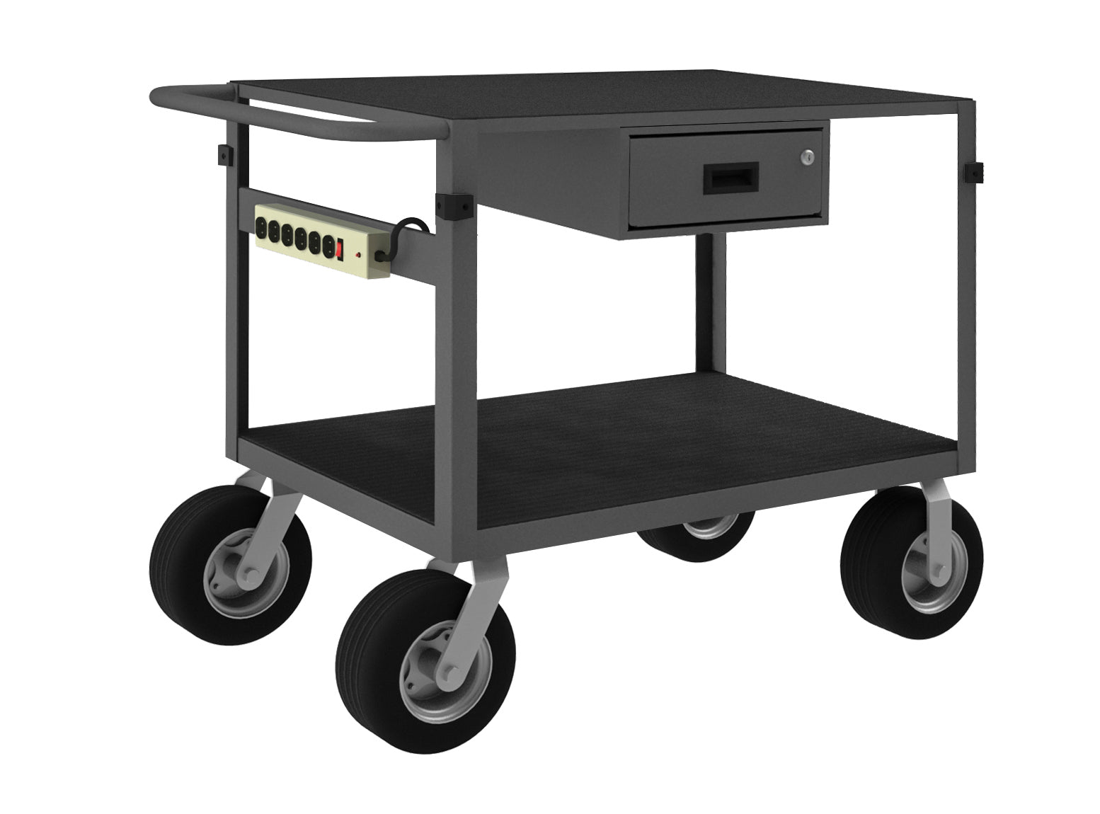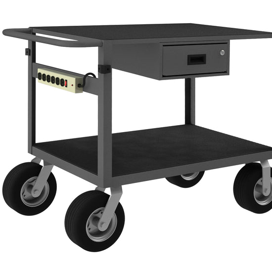 Instrument Cart, 14 Gauge Steel, 2 Shelves, 24 x 36, 1000 lbs. Capacity, Wood Top w/ Vinyl Matting Cover, Corner Bumpers, Power Strip, 10" x 3-5/16" Pneumatic Casters - (2) Rigid, (2) Swivel, Gray