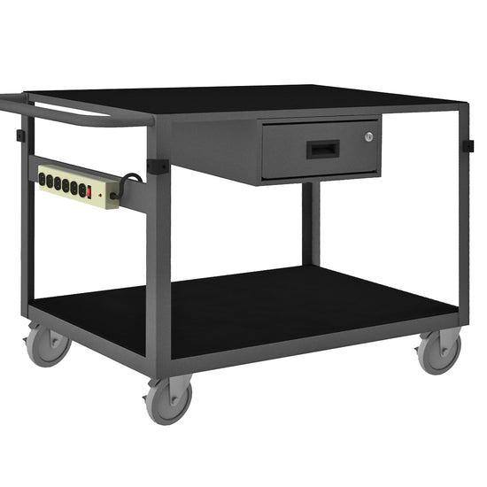 Instrument Cart, 14 Gauge Steel, 2 Shelves, 24 x 36, 1000 lbs. Capacity, Wood Top w/ Vinyl Matting Cover, Corner Bumpers, Power Strip, 5" x 1-1/4" Polyurethane Caster - (4) Swivel w/ Side Brake, Gray