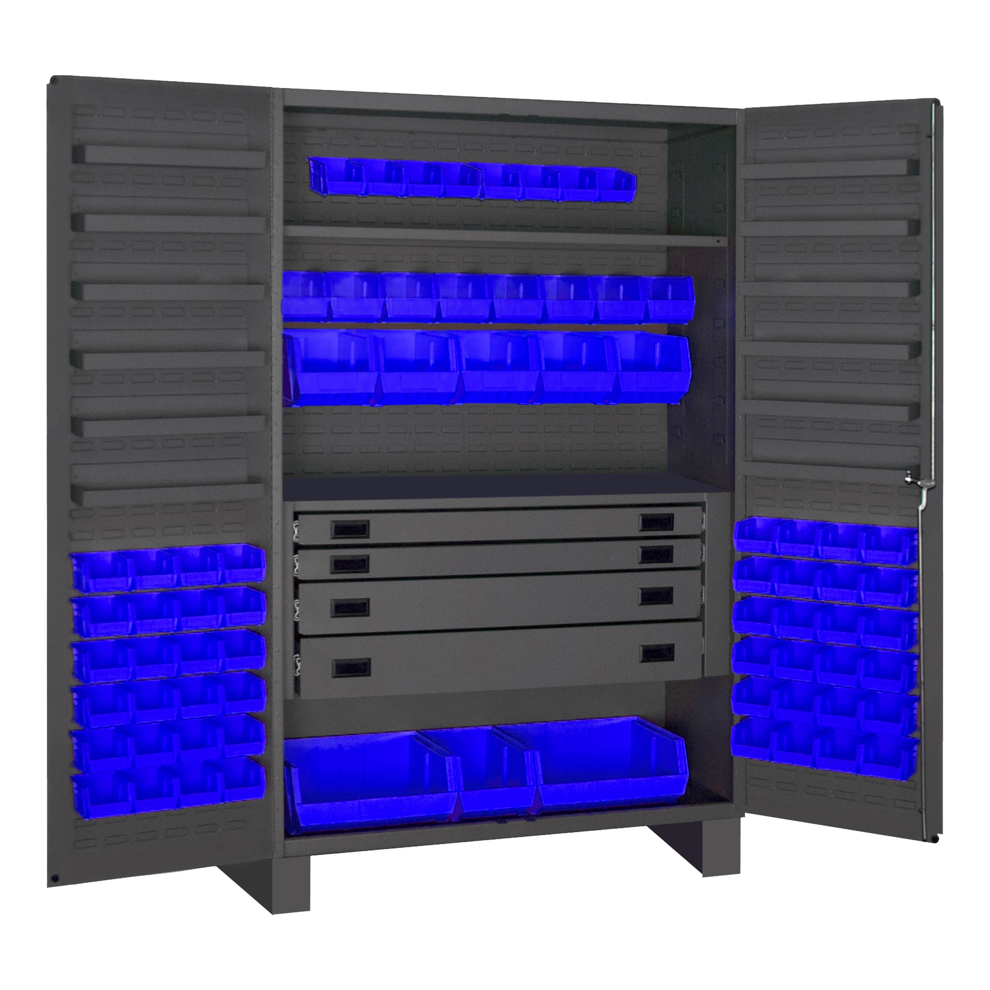 Heavy Duty Cabinet, 14 Gauge, 48 x 24 x 78, 1 Fixed Shelf, 1 Adjustable Shelf, 72 Blue Bins, Flush Doors with Louvered Panel, 4 Drawers, 12 Door Shelves, Lockable, Chrome Handle with Keys, Gray