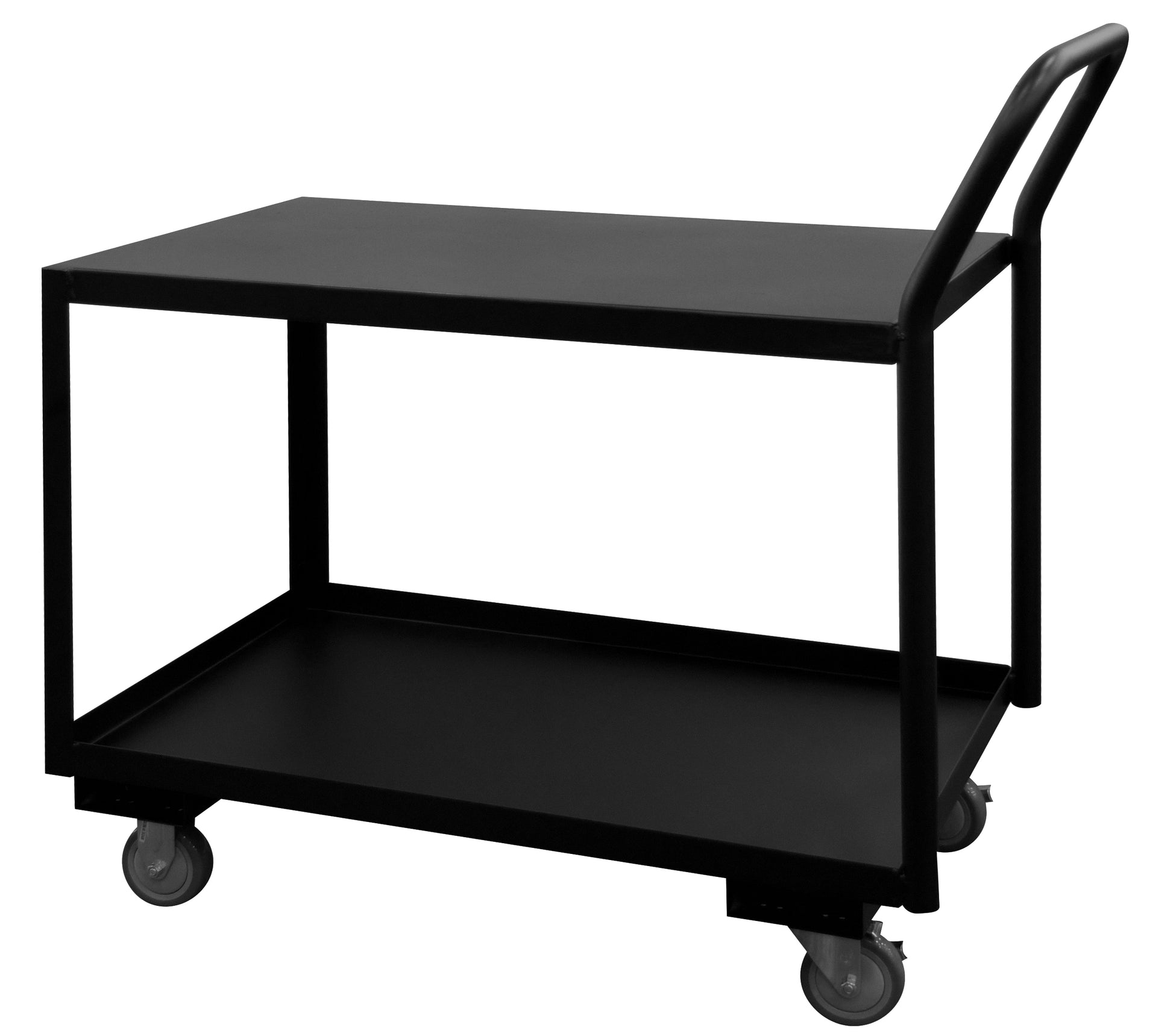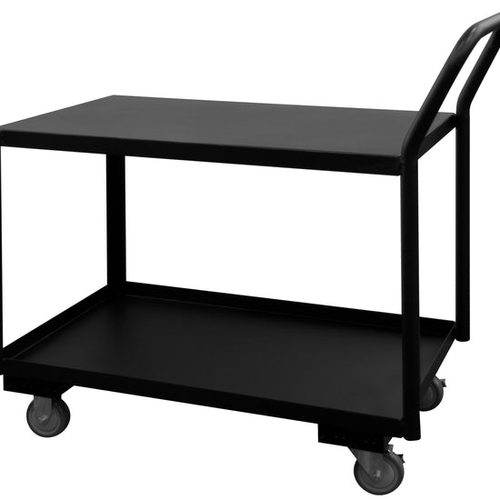 Low Deck Service Truck with 4" x 1-1/4" Polyurethane Casters - (2) Rigid, (2) Swivel with Side Brakes, 2 Shelves, 1-1/2" Lips Up on Bottom Shelf, Tubular Offset Handle, Black