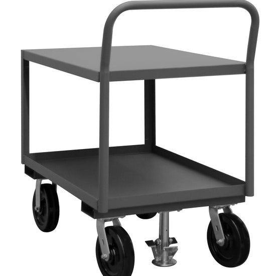Low Deck Service Truck with 8" x 2" Phenolic Casters - (2) Rigid, (2) Swivel, 2 Shelves, 1-1/2" Lips Up on Bottom Shelf, Floor Lock, Tubular Offset Push Handle, Gray