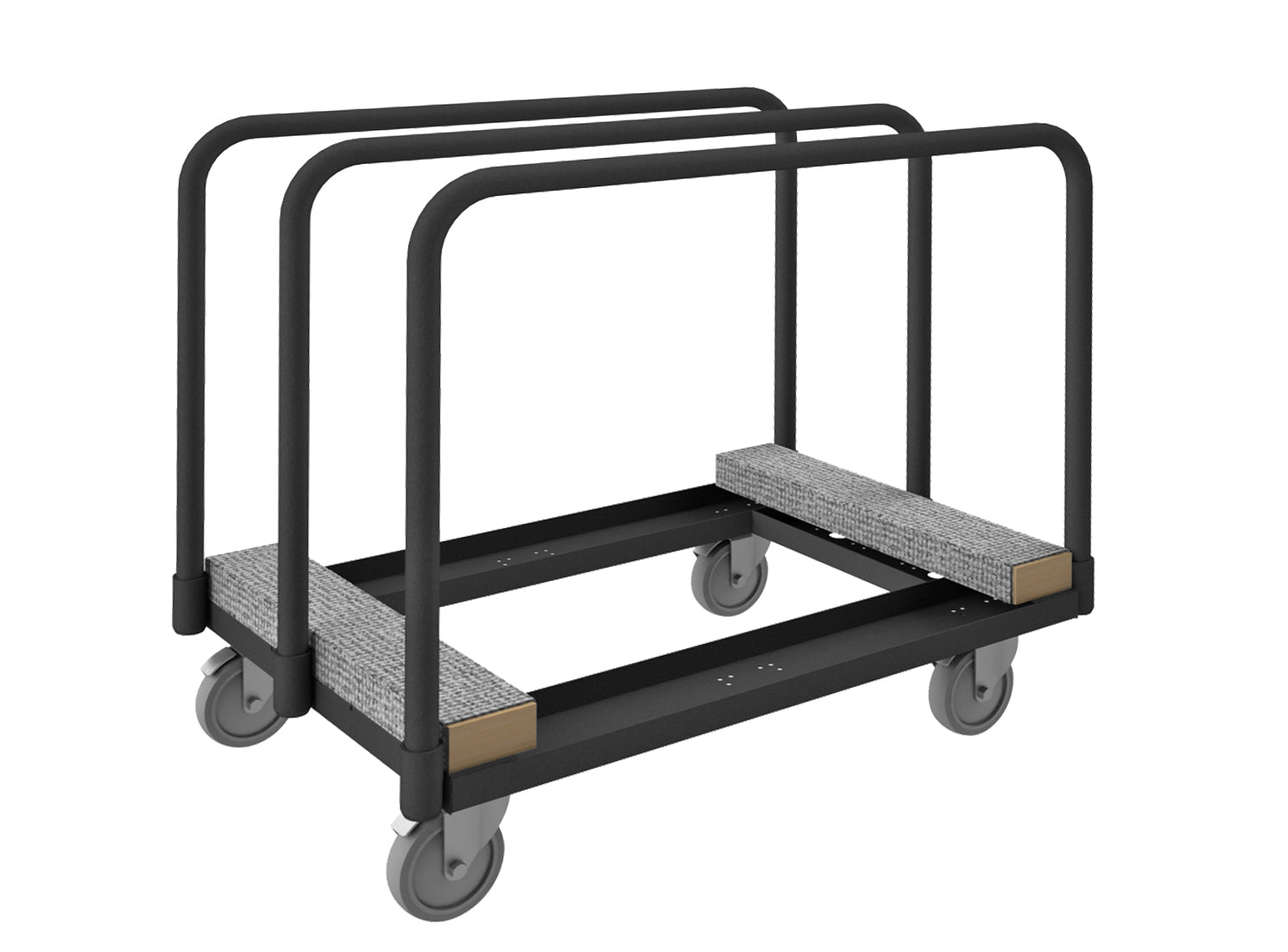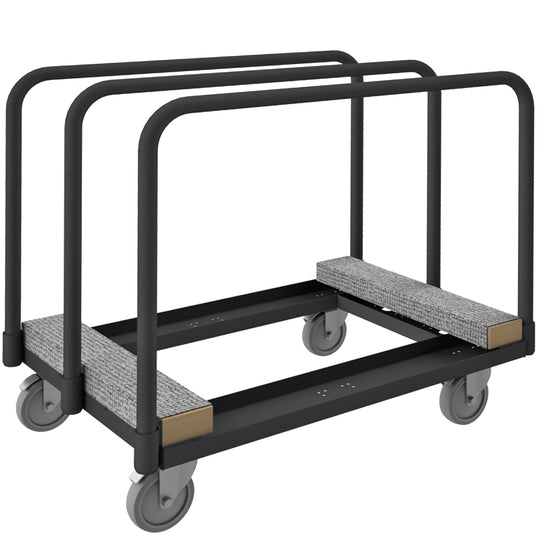 Panel Moving Truck with 5" x 1-1/4" Polyurethane Casters - (4) Swivel with Side Brakes, Wood End Rail with Carpet, 3 Removable Dividers, Gray