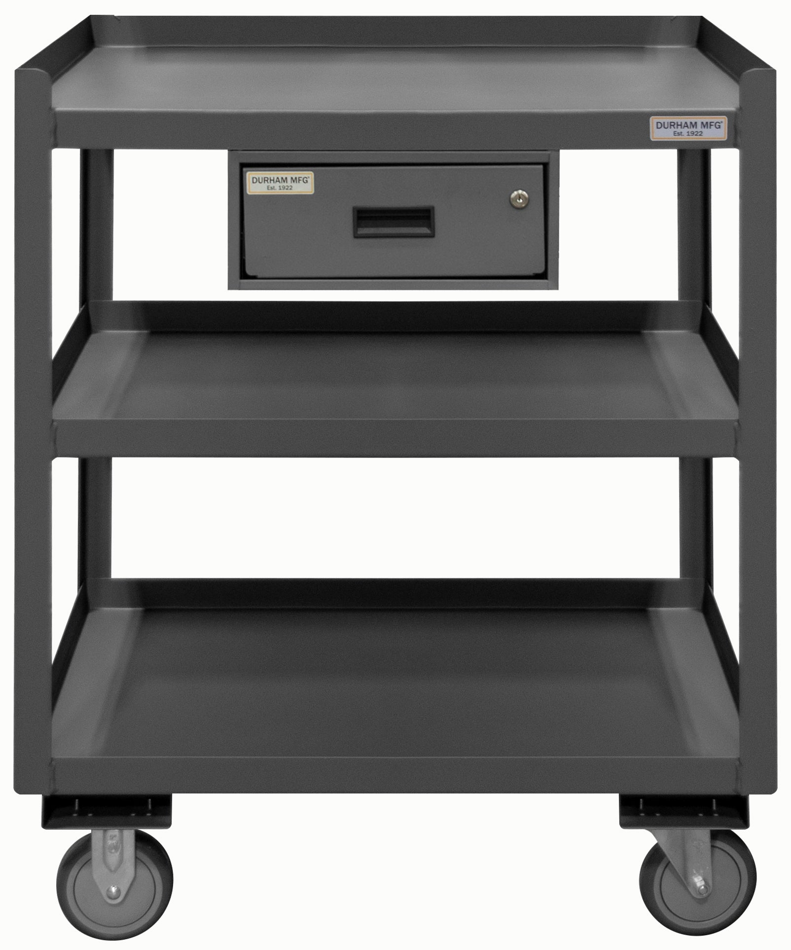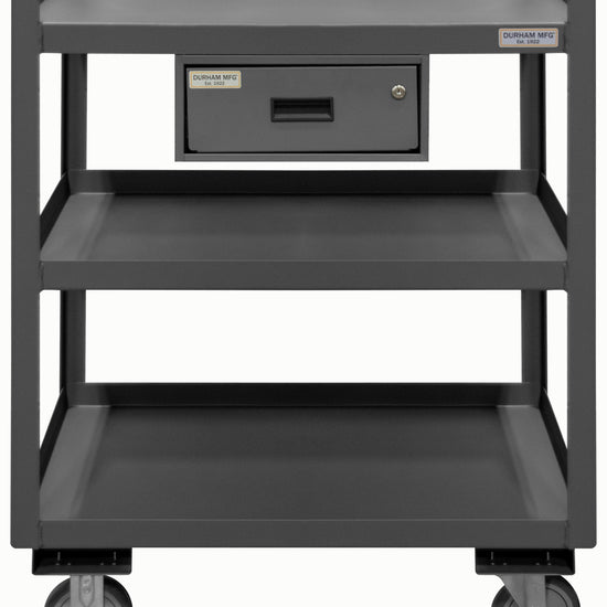 Portable Shop Desk w/ 5" x 1-1/4" Polyurethane Casters - (2) Rigid, (2) Swivel w/ Side Brakes, 3 Shelves, 1 Lockable Drawer, 1-1/2" Lips Up on 3 Sides of Top Shelf and 4 Sides of Bottom Shelves, Gray