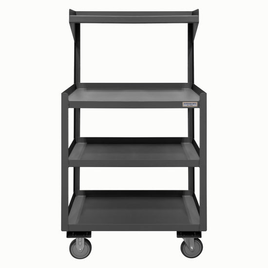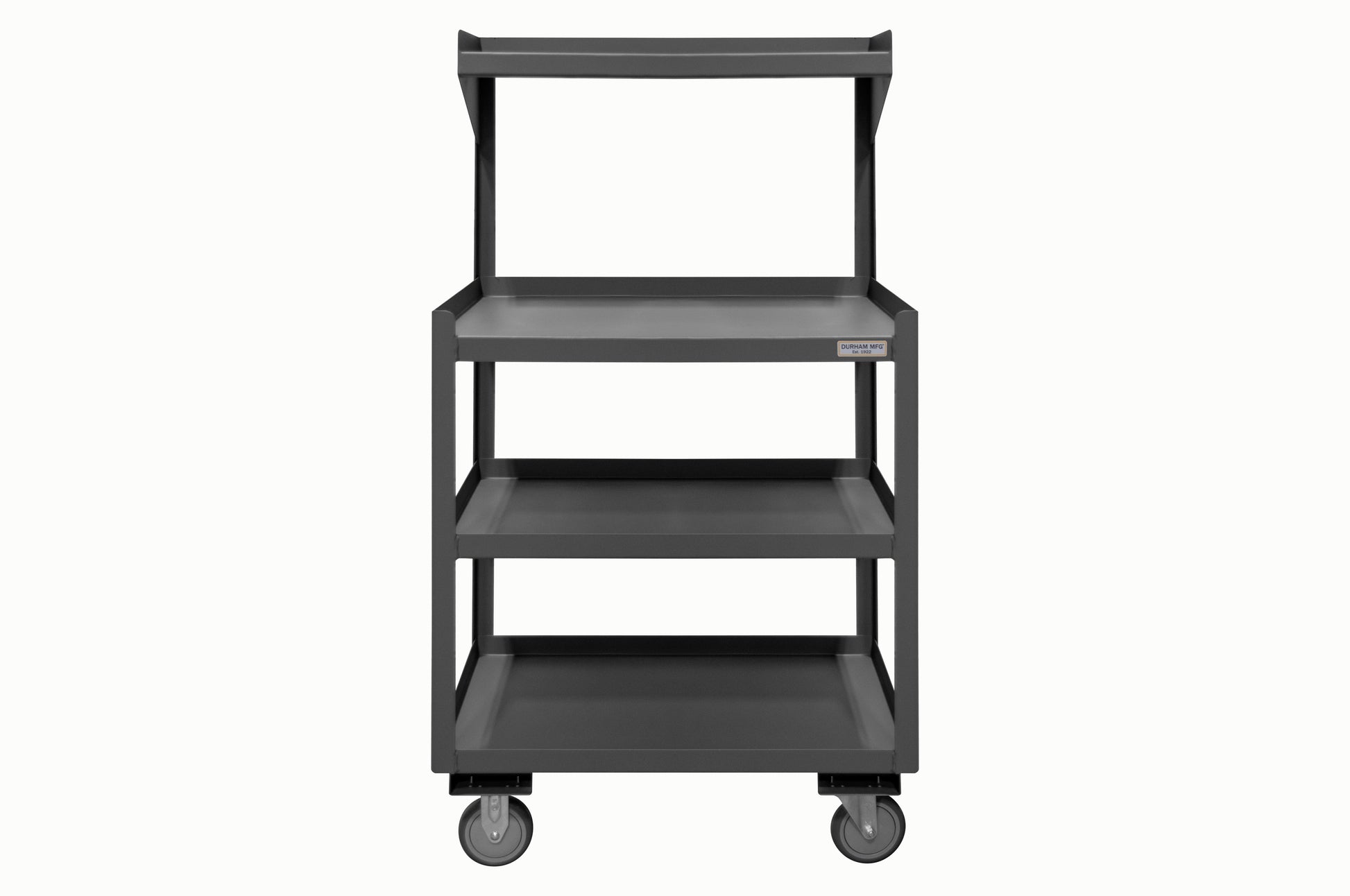 Portable Shop Desk with 5" x 1-1/4" Polyurethane Casters (2) Rigid, (2) Swivel with Side Brakes, 4 Shelves, 1-1/2" Lips Up on 3 Sides of Top Shelf and 4 Sides of Bottom Shelves, Gray