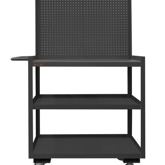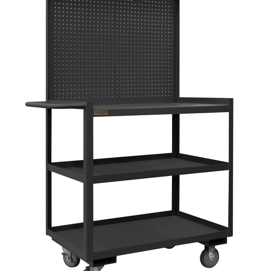 Stock Cart/WorkStation with Pegboard Panel, 3 Shelves, 24 x 36, 14 Gauge, 1200 lbs. Capacity, 5" x 1-1/4" Polyurethane Casters - (2) Rigid, (2) Swivel with Side Brakes, Gray