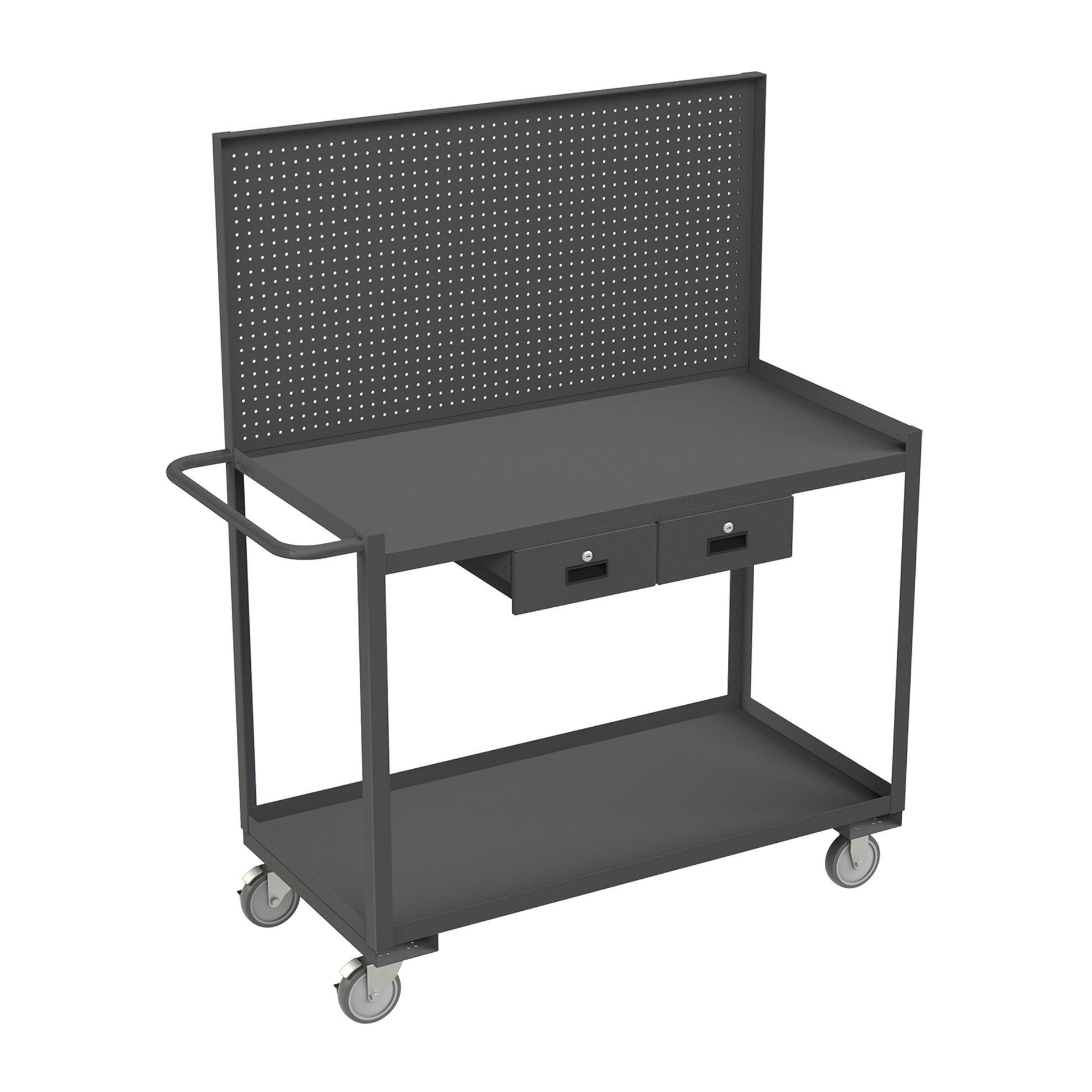 Stock Cart/WorkStation with Pegboard Panel, 2 Shelves - 24 x 48, 14 Gauge, 1200 lbs. Capacity, 2 Drawers, 5" x 1-1/4" Polyurethane Casters - (2) Rigid, (2) Swivel with Side Brakes, Gray