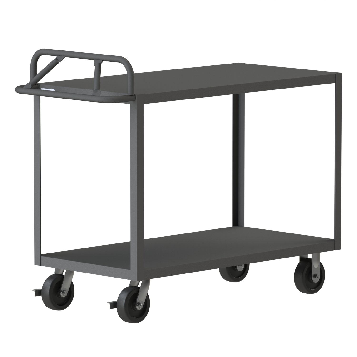 Stock Cart, 2 Shelves, 24 x 48, 14 Gauge, 3600 lbs. Capacity, Ergonomic Handle, 6" x 2" Phenolic Casters - (2) Rigid, (2) Swivel with Side Brakes, Gray