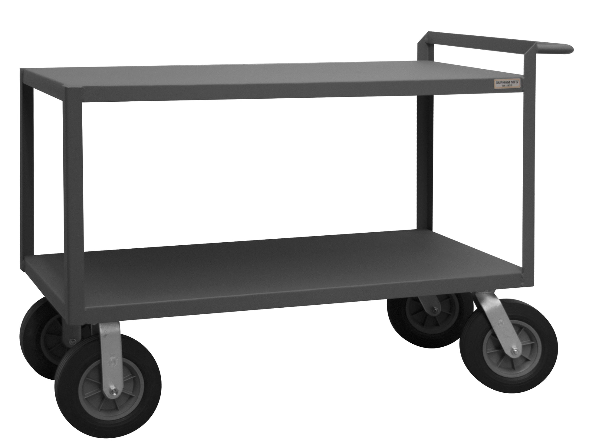 Stock Cart, 2 Shelves, 24 x 48, 14 Gauge, 1500 lbs. Capacity, Raised Handle, 10" x 2-9/16" Semi-Pneumatic Casters - (2) Rigid, (2) Swivel, Gray