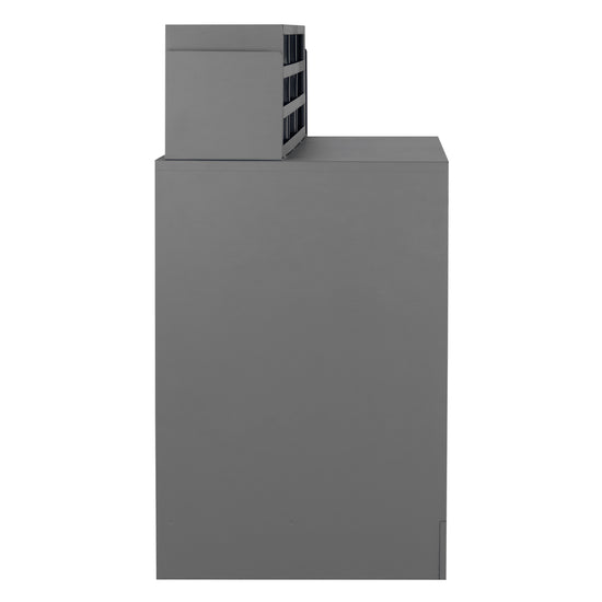 Stationary File Workstation And Stand Up Desk, 1 Shelf, 3 File Drawers, 1 Storage Drawer, Horizontal Literature Rack with 9 Compartments, Gray