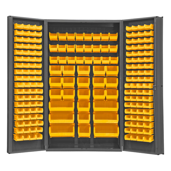 Heavy Duty Cabinet, 14 Gauge, 48 x 24 x 84, 192 Yellow Bins, 4" Deep Box Doors with Louvered Panel, Lockable, Chrome Handle with Keys, Gray