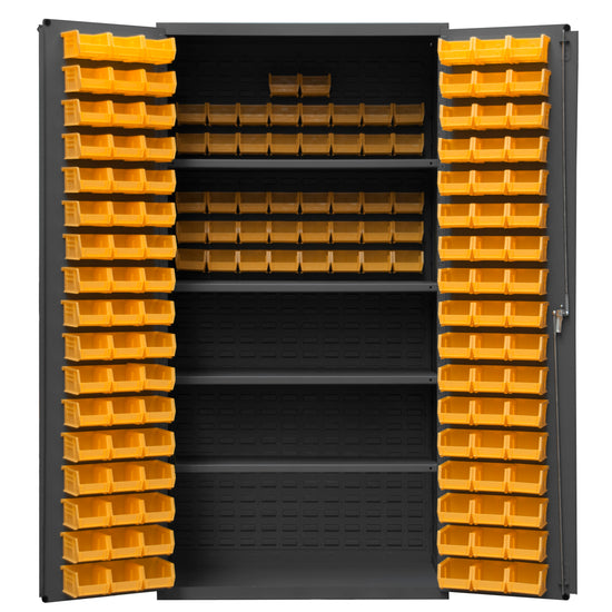 Heavy Duty Cabinet, 14 Gauge, 48 x 24 x 84, 4 Adjustable Shelves, 144 Yellow Bins, Flush Doors with Louvered Panel, Lockable, Chrome Handle with Keys, Gray